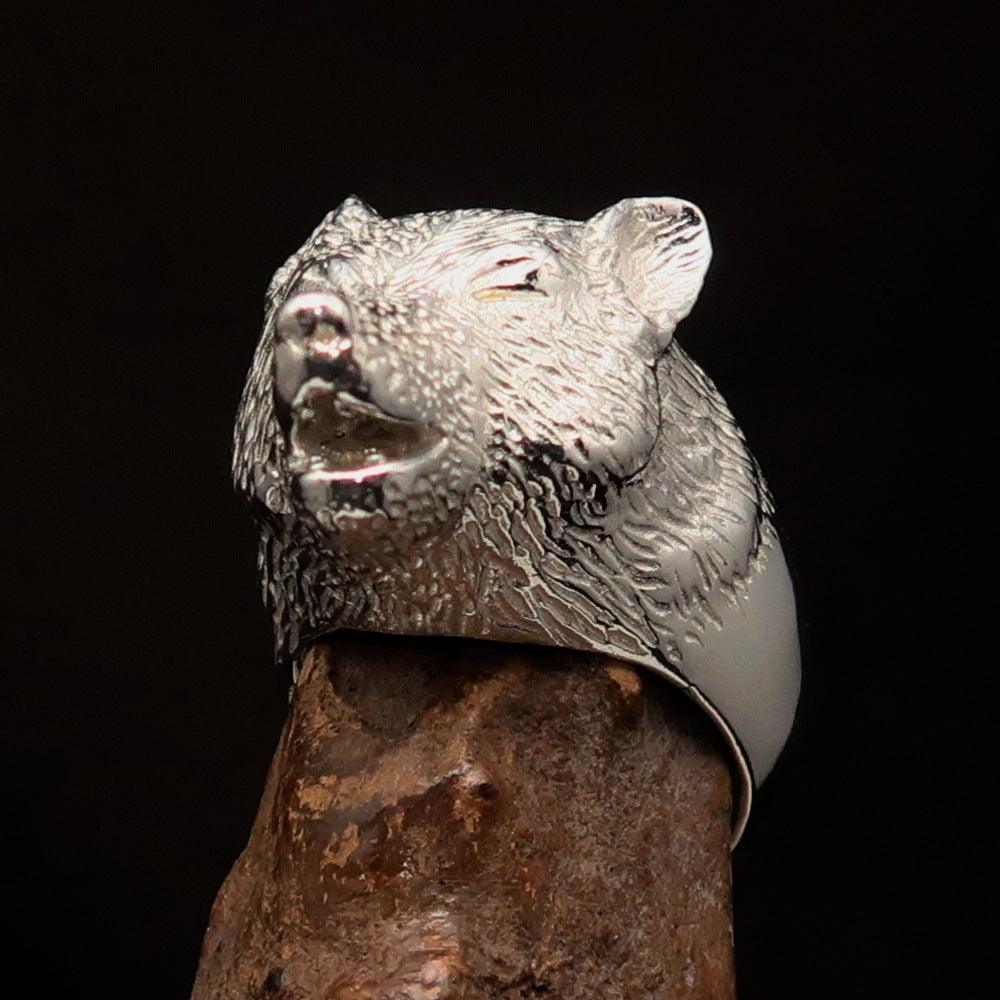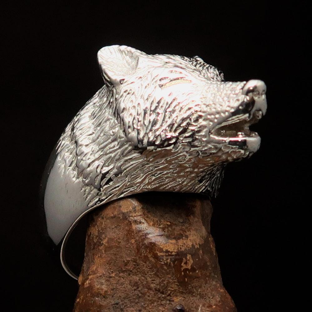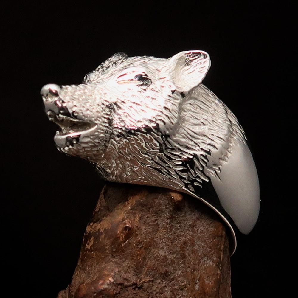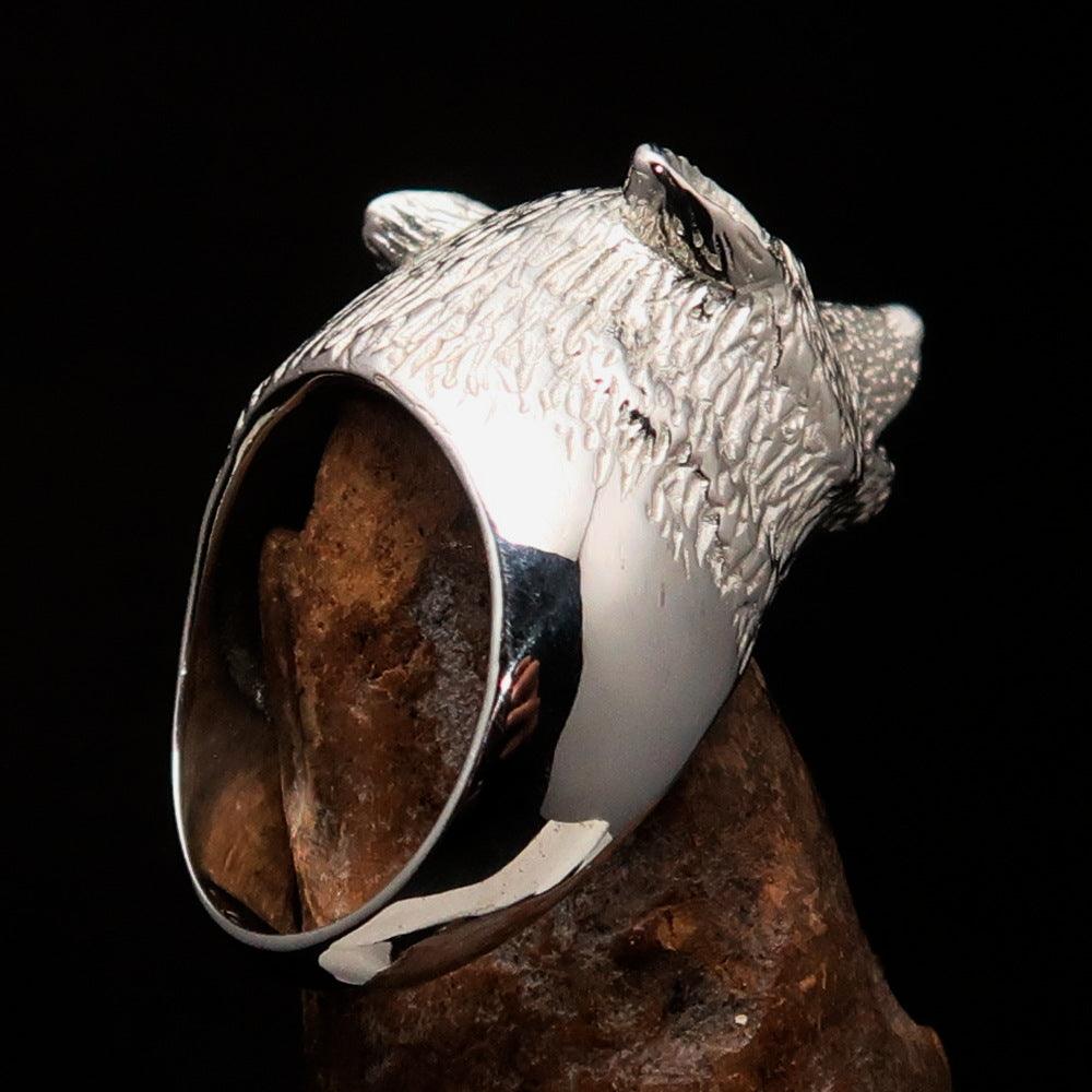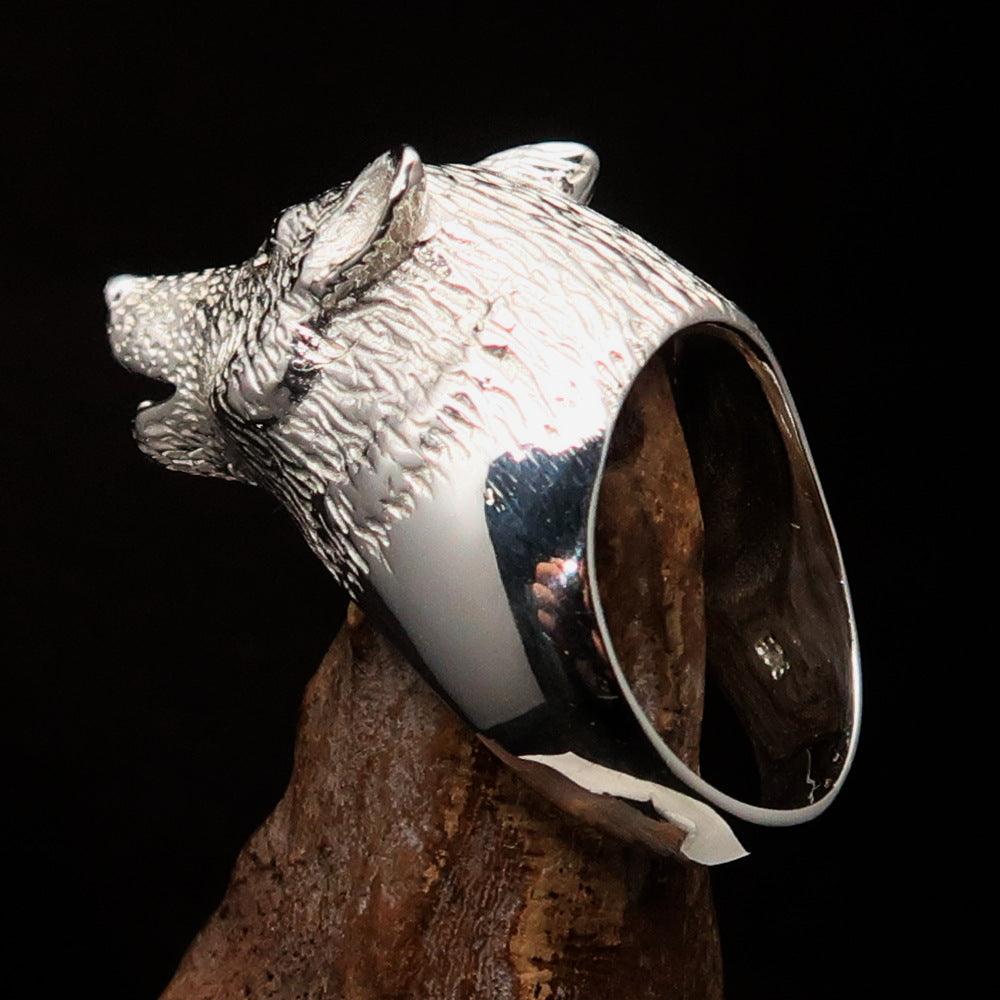 Men's howling wolf ring made of shiny Sterling Silver, featuring a detailed wolf design and a polished finish.