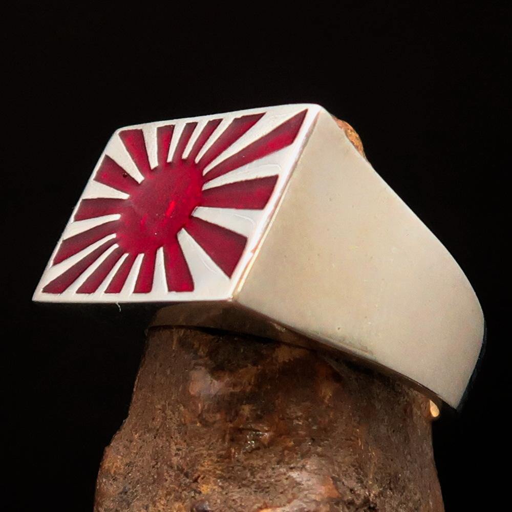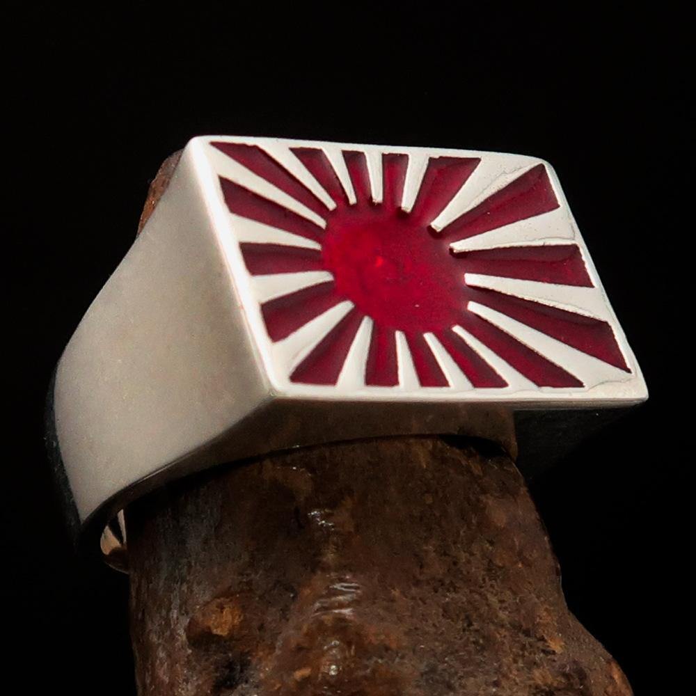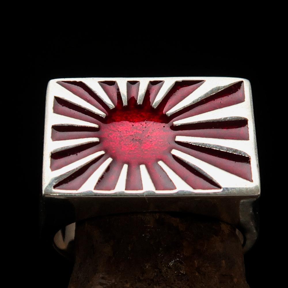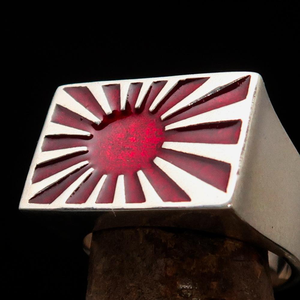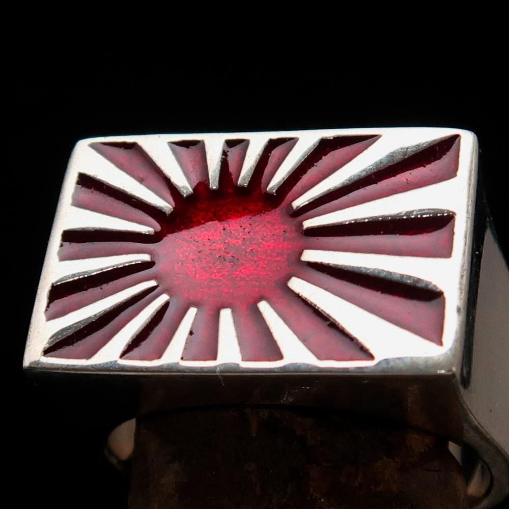 Introducing the exquisite Men's Japanese War Flag Ring Raising Sun, a stunning piece of jewelry that combines cultural significance with modern craftsmanship. Made from solid sterling silver, this ring is not only a fashion statement but also a tribute to the rich history of Japan. The high-polished finish and vibrant red enamel detailing make it a standout accessory for any occasion.