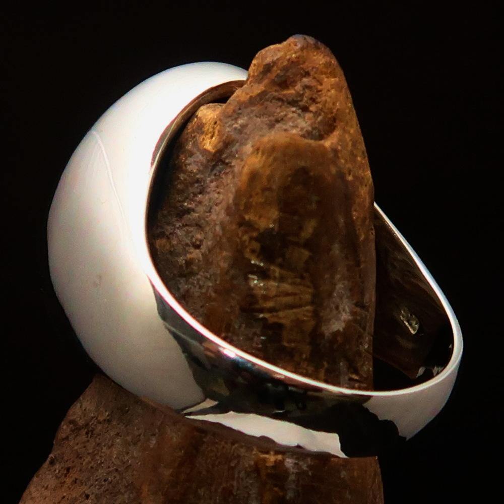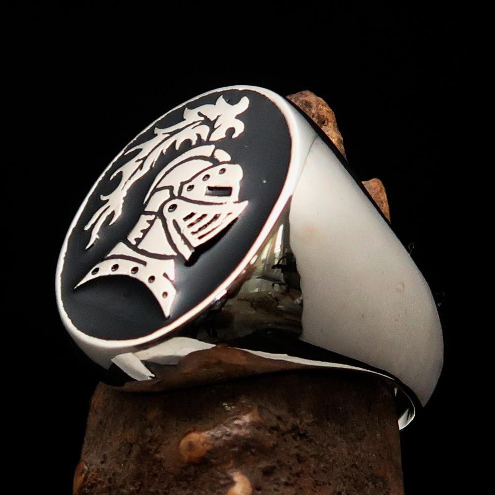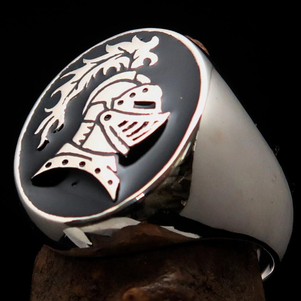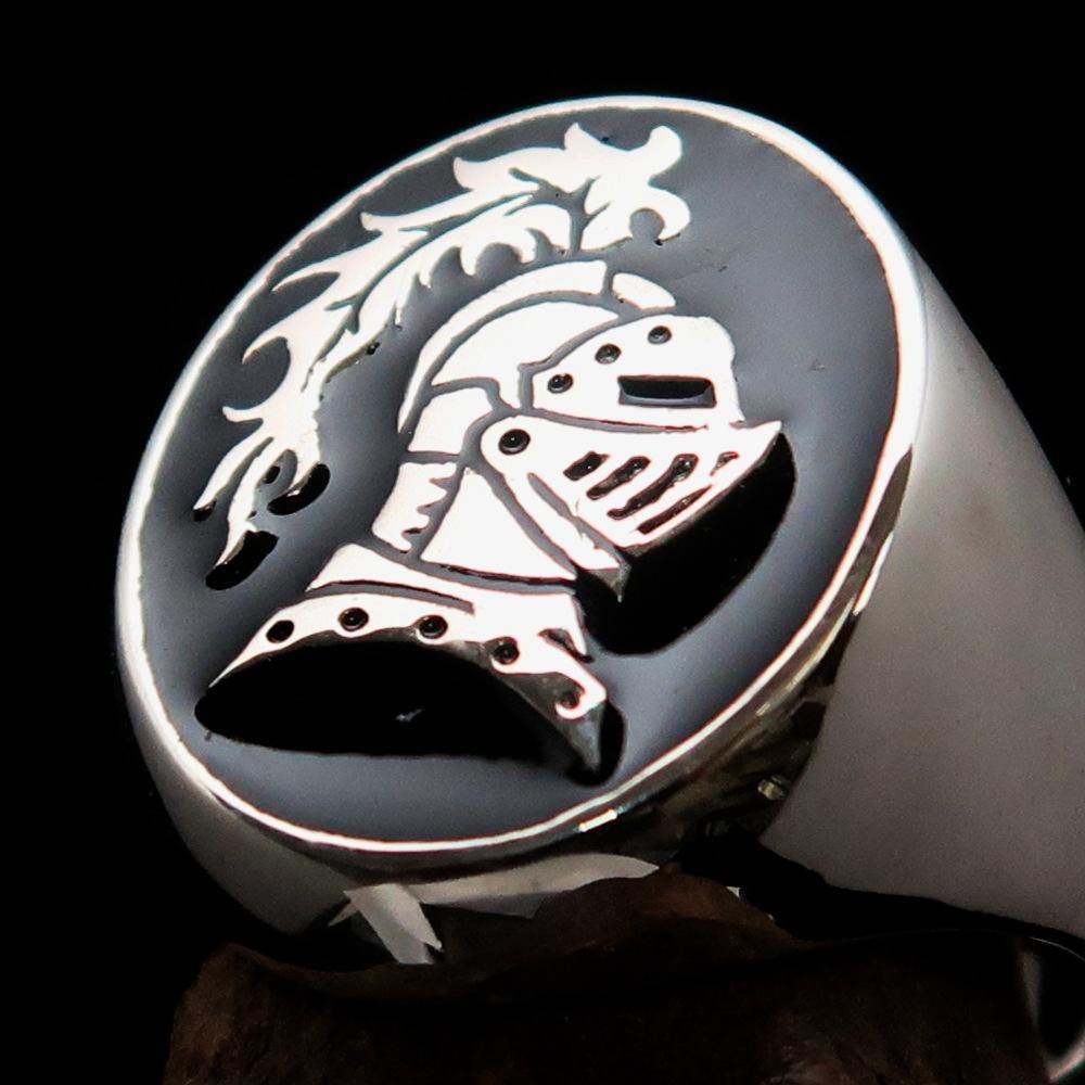Introducing the Perfectly Crafted Men's Medieval Ring Brave Knight Black - Sterling, a stunning piece of jewelry that combines elegance and strength. This solid sterling silver biker ring features a high-polished finish complemented by striking black enamel, making it a perfect accessory for any occasion. The ring is hallmarked 925, ensuring its authenticity and quality.
