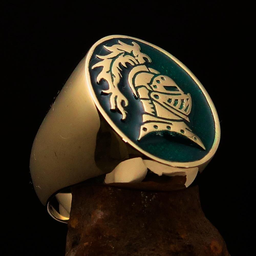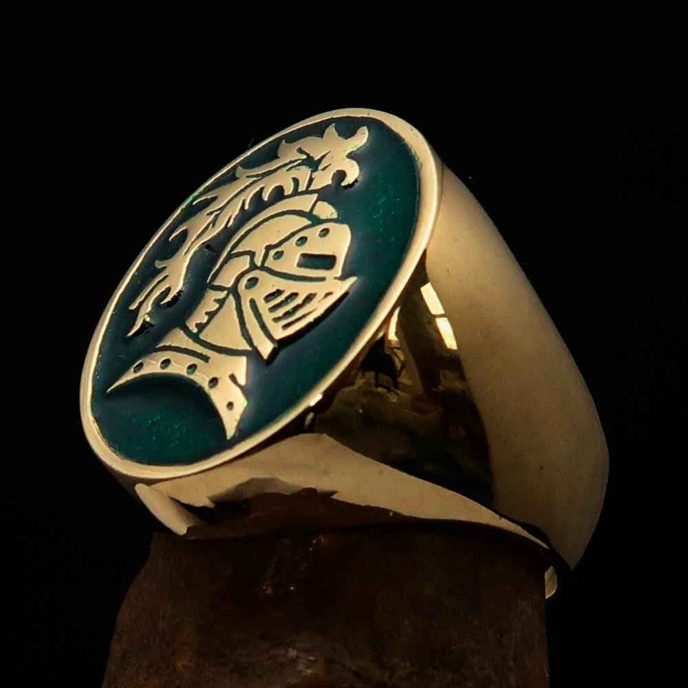 Introducing the Men's Medieval Ring Brave Knight, a stunning piece of jewelry that combines durability and style. Crafted from solid brass, this ring is designed for those who appreciate the bold aesthetics of medieval-inspired accessories. The high-polished finish, complemented by a striking green enamel, makes this ring a standout piece for any collection.