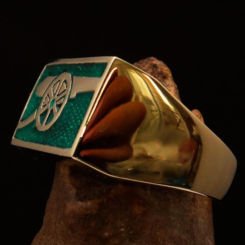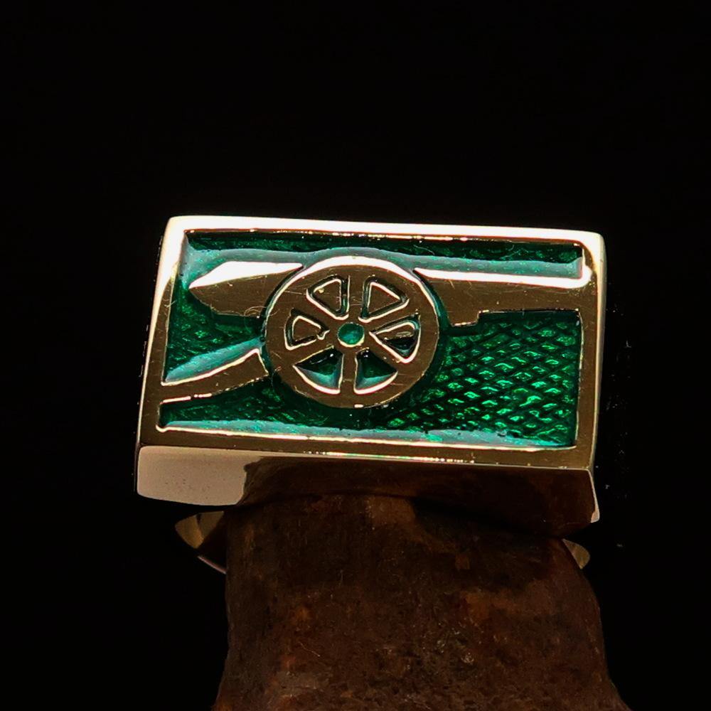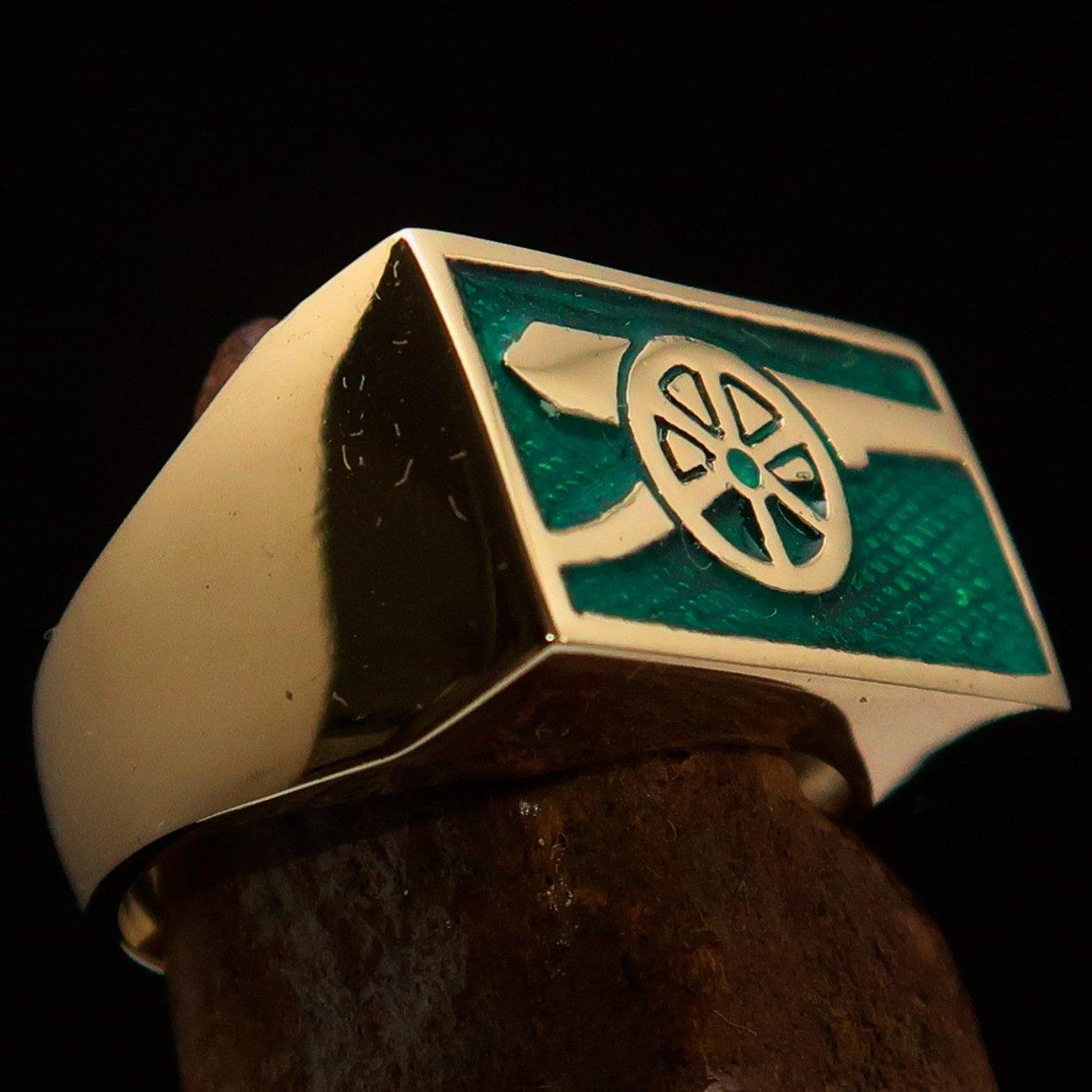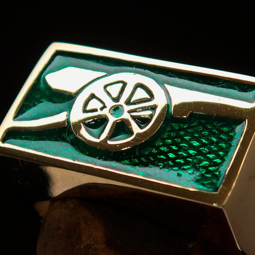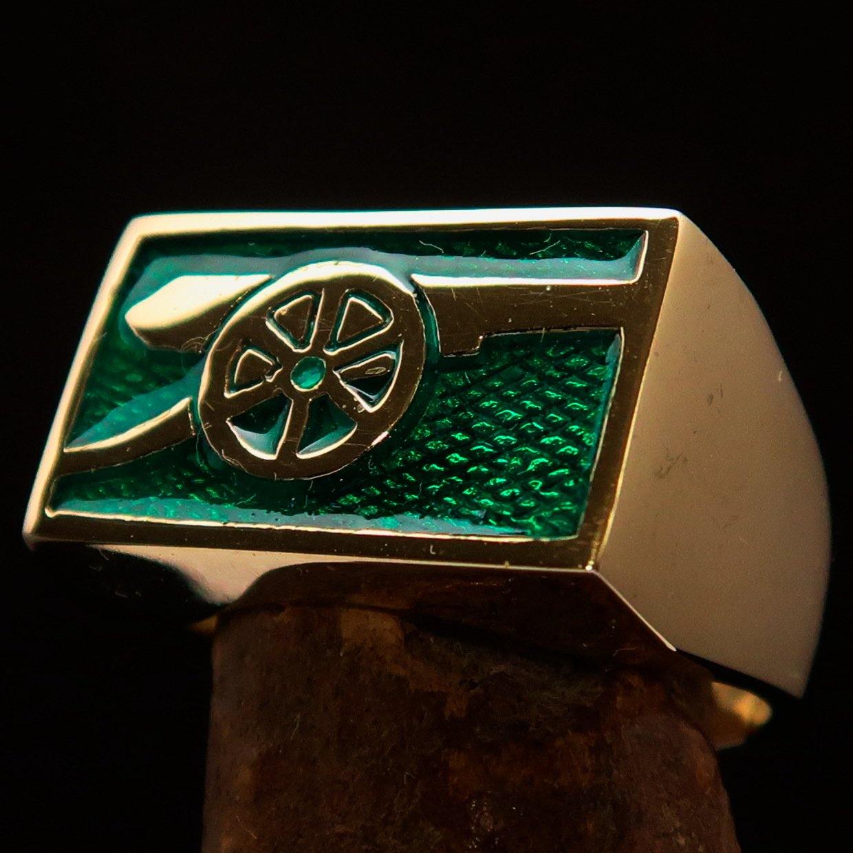 Introducing the Perfectly Crafted Men's Naval Cannon Ring, a stunning piece of jewelry that combines elegance and uniqueness. Made from solid brass, this ring features a high-polished finish that enhances its luxurious appearance. The vibrant green enamel adds a touch of color, making it a perfect accessory for any outfit or occasion.