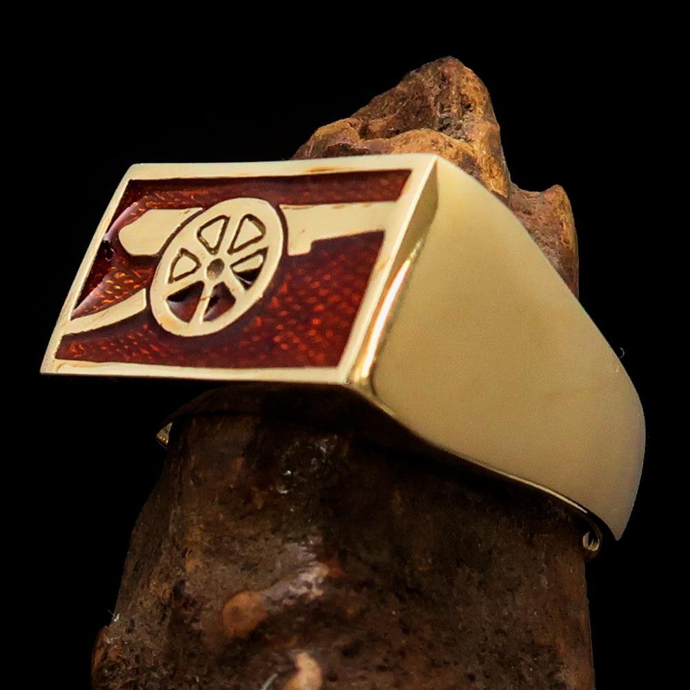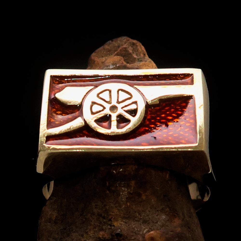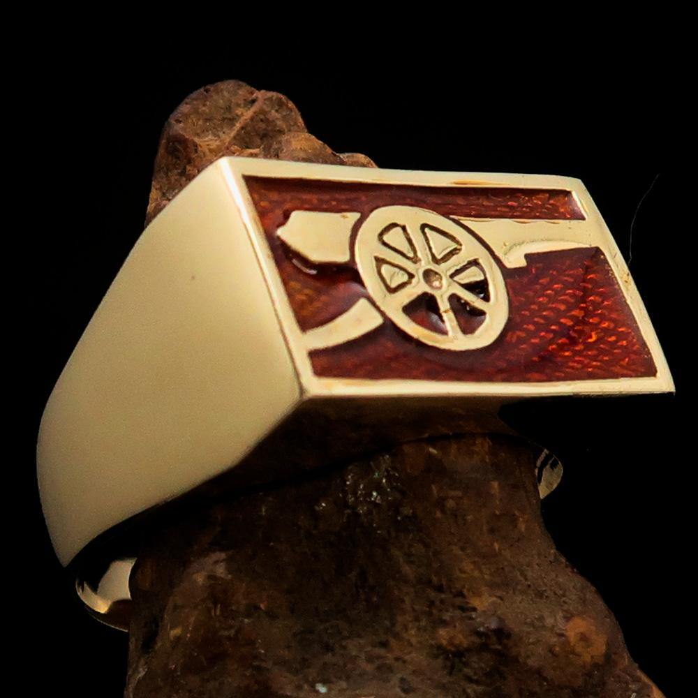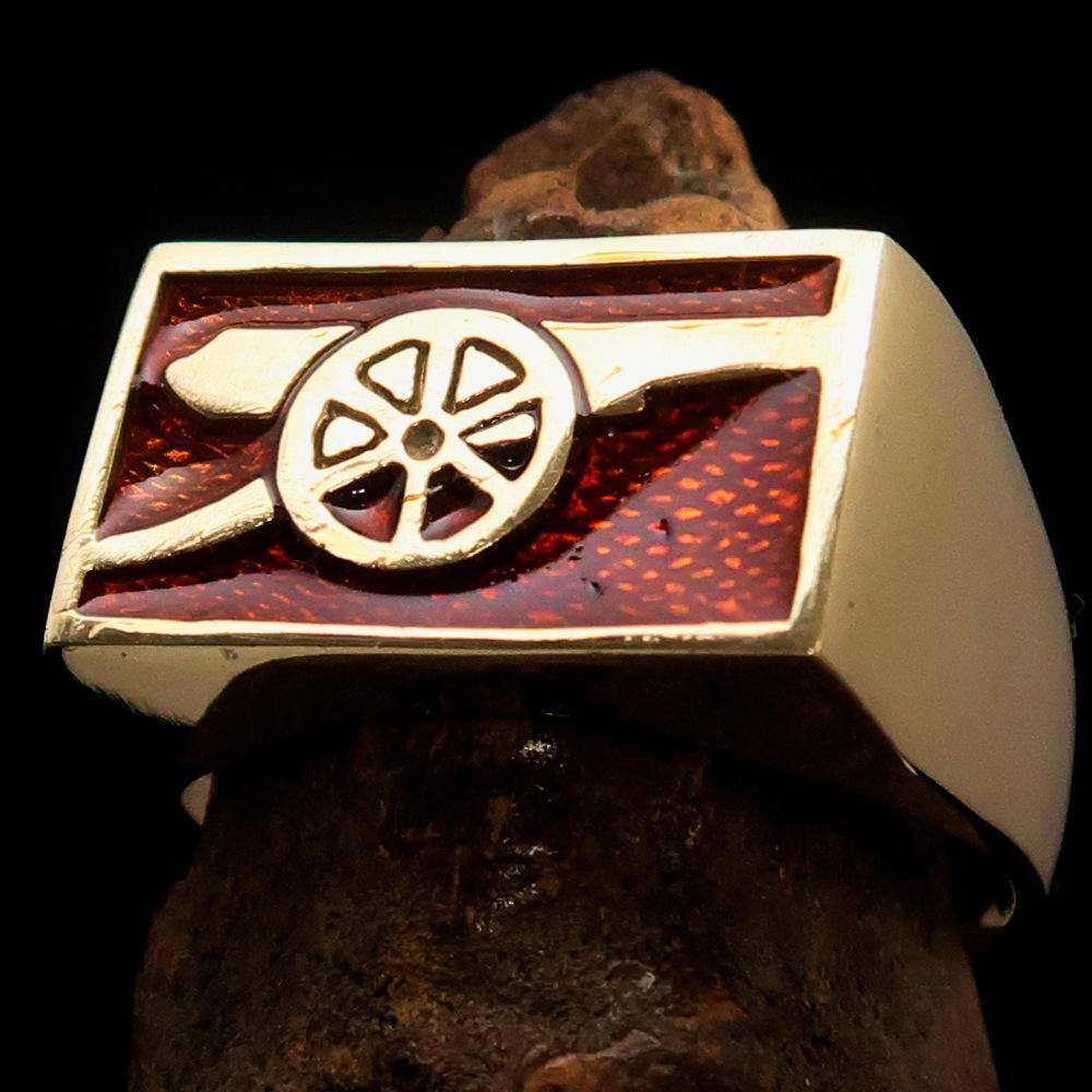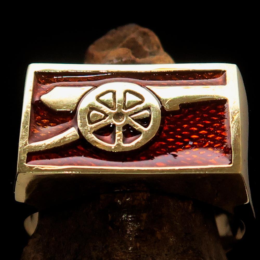 Men's Naval Cannon Ring made of solid brass with a high polished finish and vibrant orange enamel, showcasing its unique design and craftsmanship.