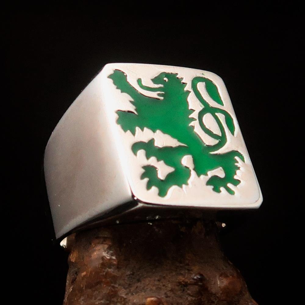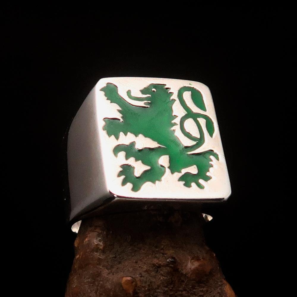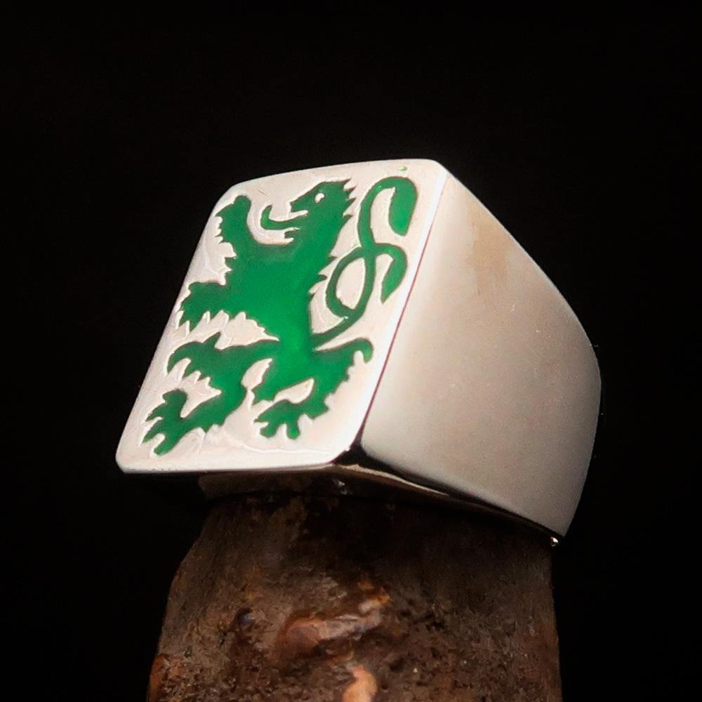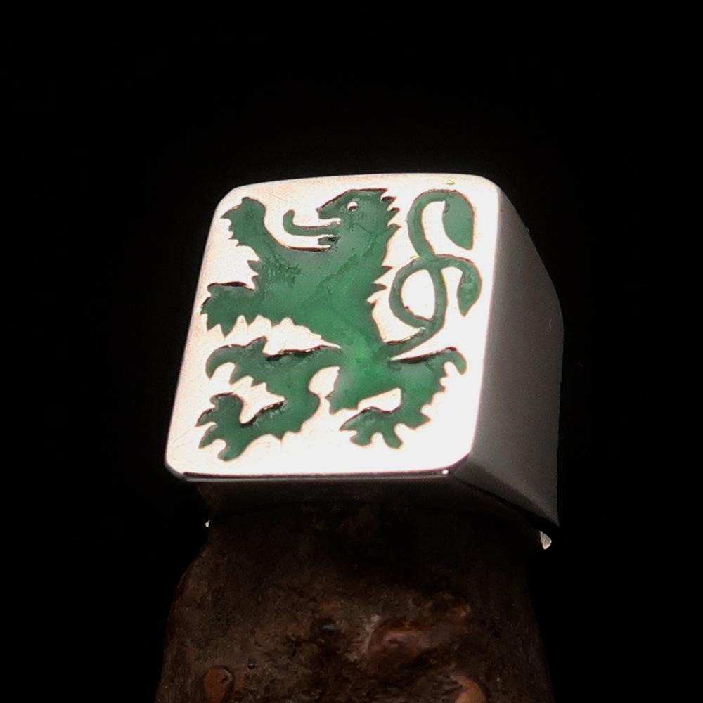 Every detail of the Men's Rampant Lion Ring has been meticulously crafted to ensure a high-polished finish that gleams with sophistication. The lion, a timeless symbol of power, is beautifully rendered, making this ring a true masterpiece. The combination of sterling silver and green enamel not only enhances its aesthetic appeal but also ensures durability and longevity.