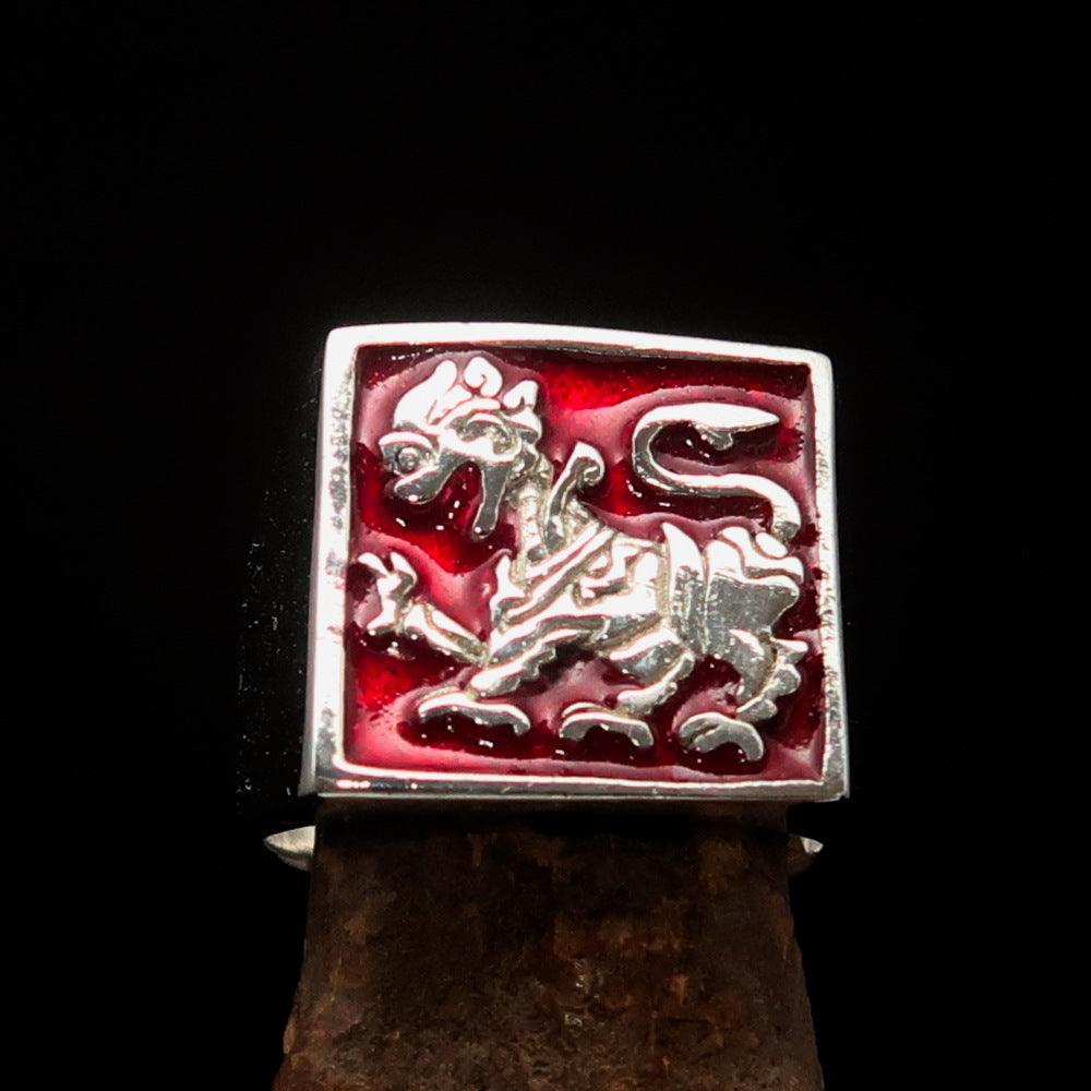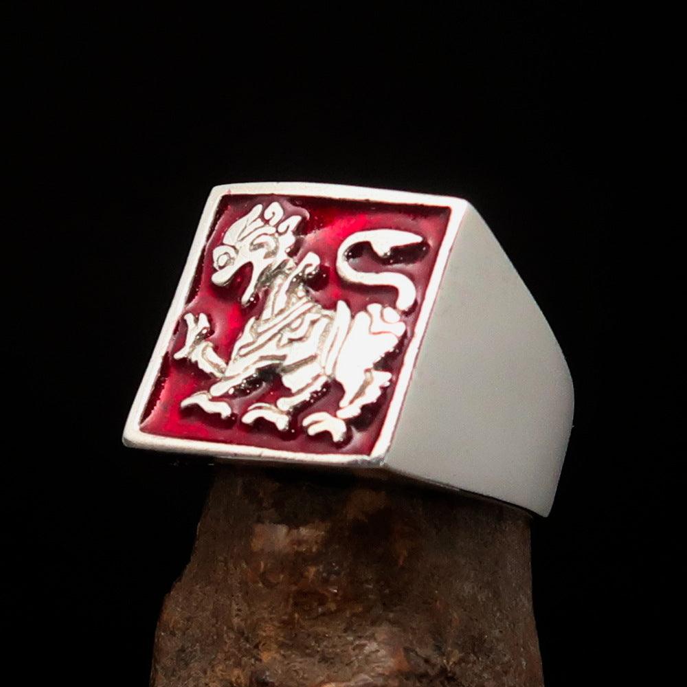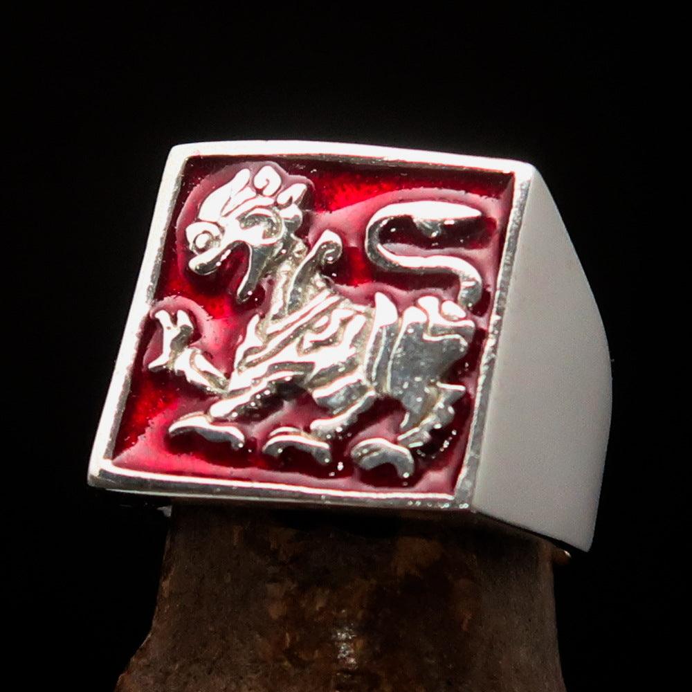 Men's red Sinhalese lion ring made of sterling silver with intricate detailing and vibrant red enamel accents.