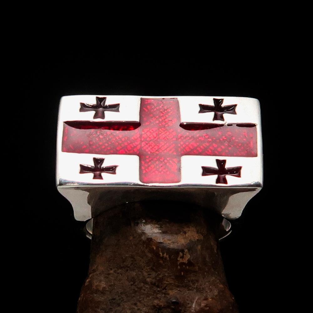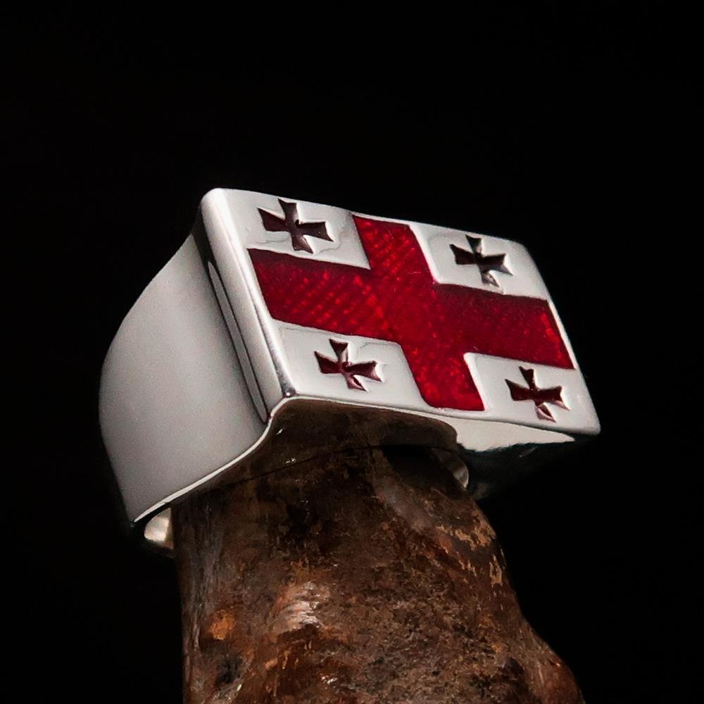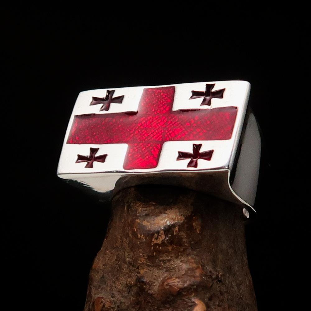Introducing the Perfectly Crafted Men's Ring Flag of Georgia, a stunning piece of jewelry that combines elegance and patriotism. Made from solid sterling silver, this ring showcases the iconic Flag of Georgia, featuring five crosses that symbolize the state's rich history and heritage. The high-polished finish, complemented by vibrant red enamel, makes this ring a standout accessory for any occasion.