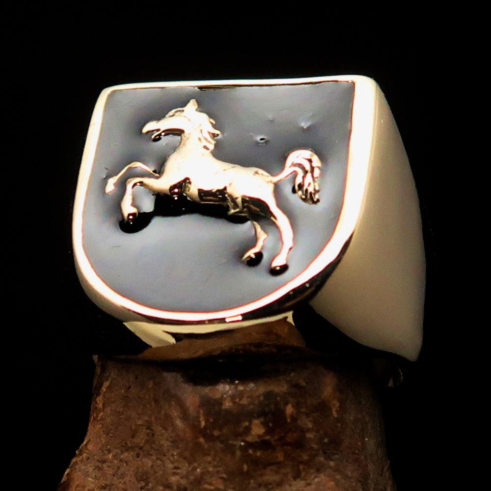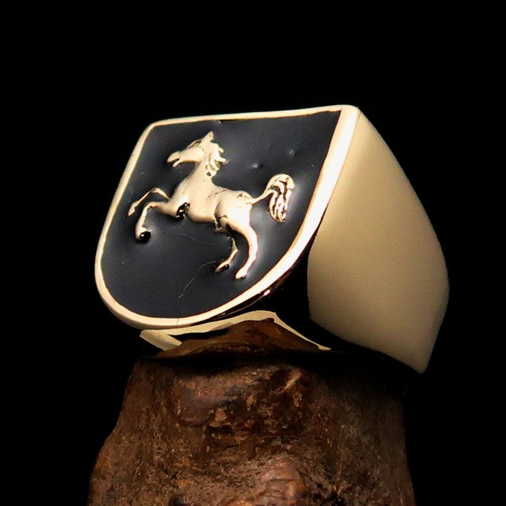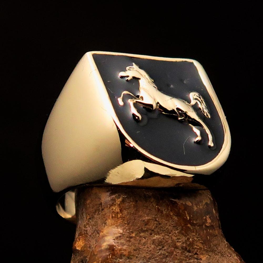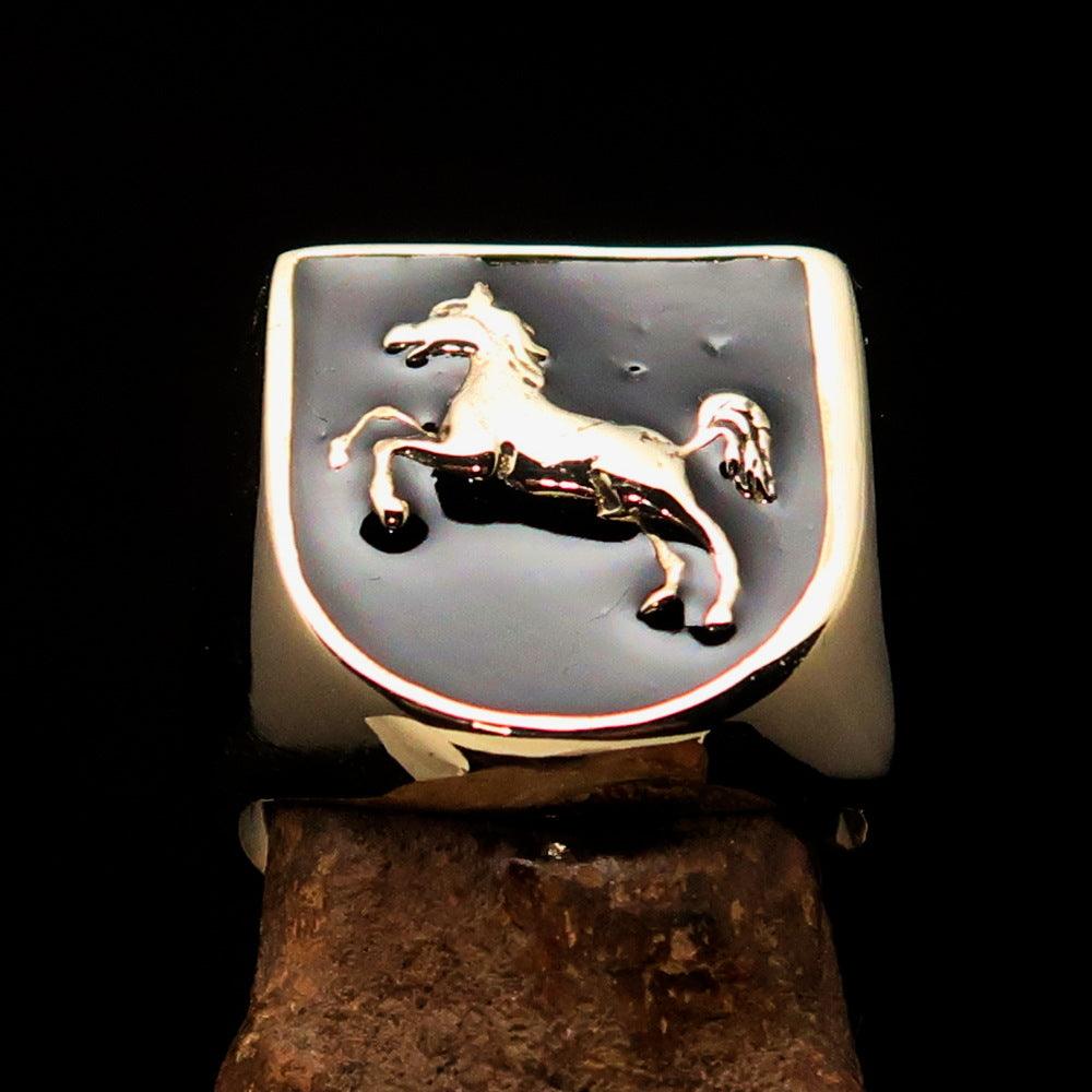 In summary, the Perfectly Crafted Men's Ring Horse Coat of Arms Black - Solid Brass is a must-have accessory for anyone looking to enhance their style. With its striking design, durable construction, and secure payment options, this ring is the perfect addition to your jewelry collection. Don't miss out on the opportunity to own this exquisite piece of craftsmanship.