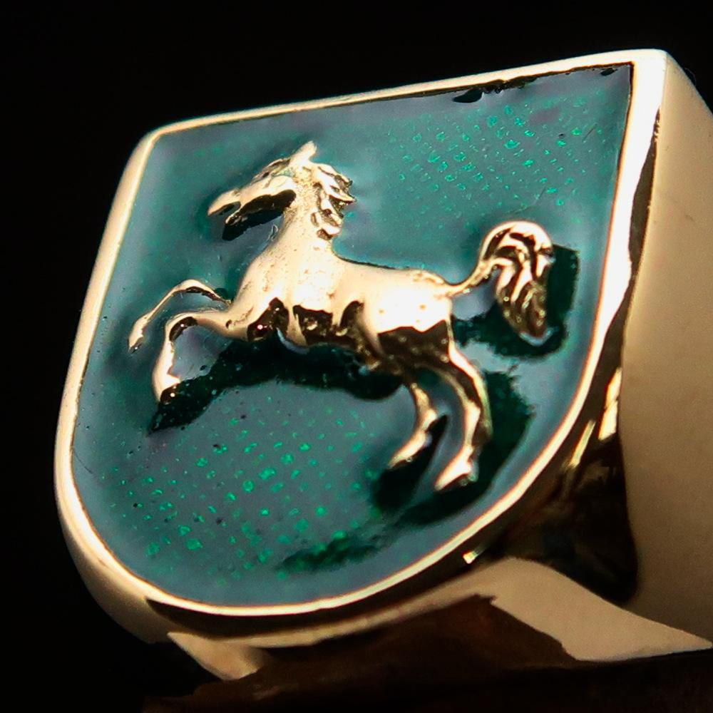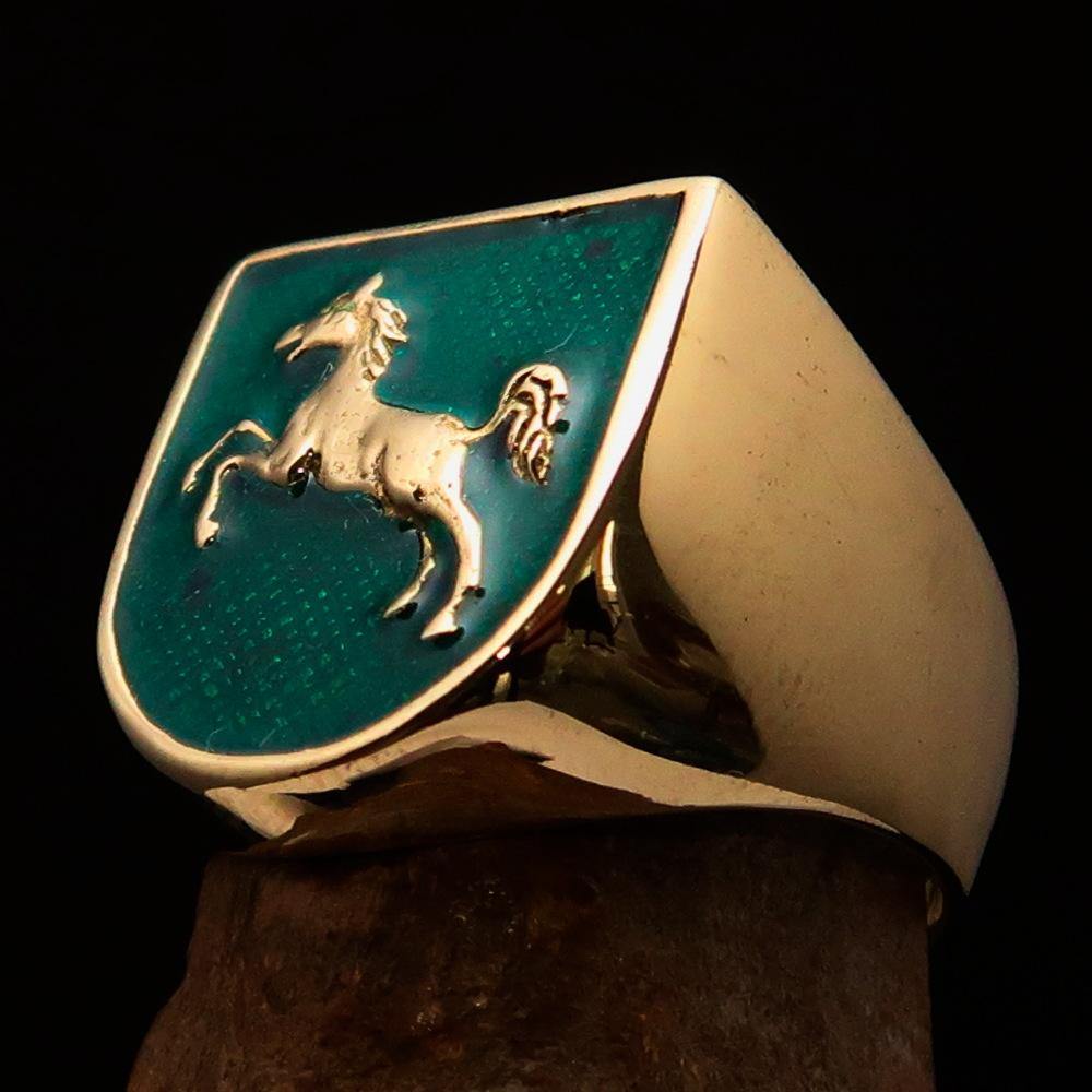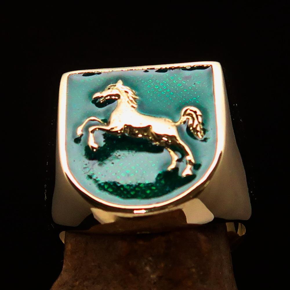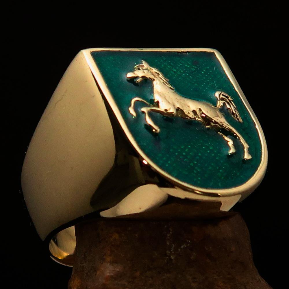 Perfectly Crafted Men's Ring featuring Horse Coat of Arms design in solid brass with green enamel accents.