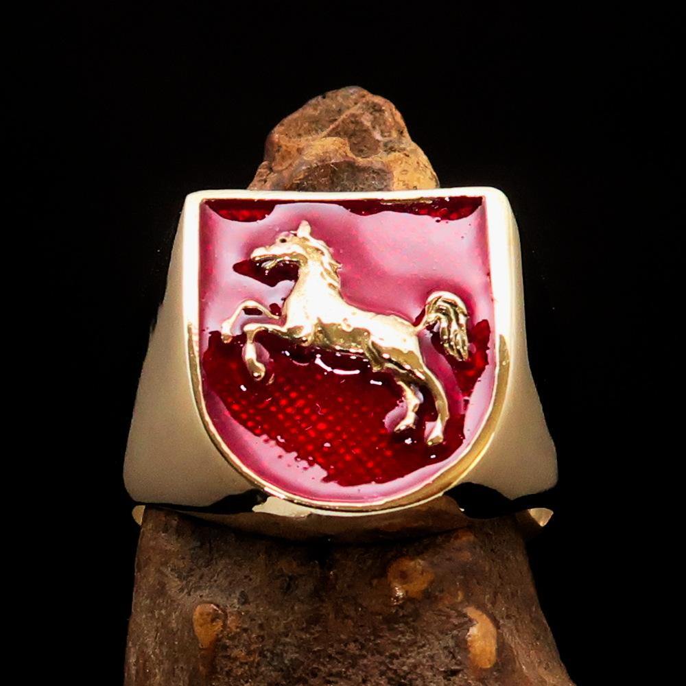 This Men's Ring Horse Coat of Arms Red - Solid Brass is not just a piece of jewelry; it's a statement of elegance and individuality. Designed for the modern man, this ring combines traditional craftsmanship with contemporary style, making it an ideal accessory for any occasion. Whether you're dressing up for a formal event or adding flair to your everyday attire, this ring is sure to impress.