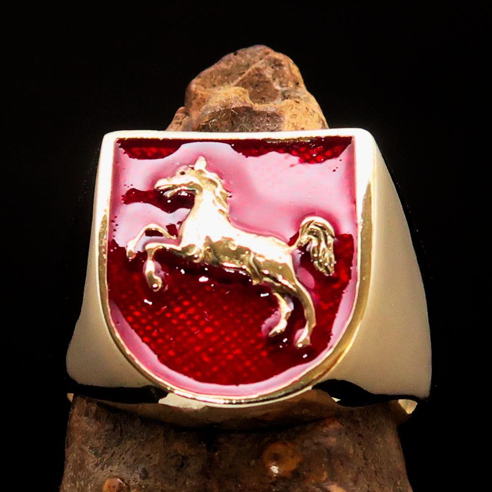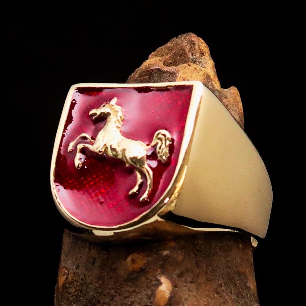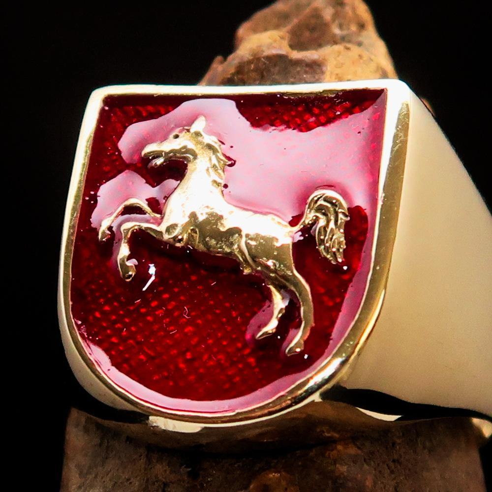 In summary, the Men's Ring Horse Coat of Arms is a beautifully crafted piece that combines elegance, durability, and unique design. With its solid brass construction, stunning red enamel, and high polish finish, it is sure to become a favorite in your jewelry collection. Don't miss out on the opportunity to own this exceptional ring; order yours today and enjoy the perfect blend of style and craftsmanship.