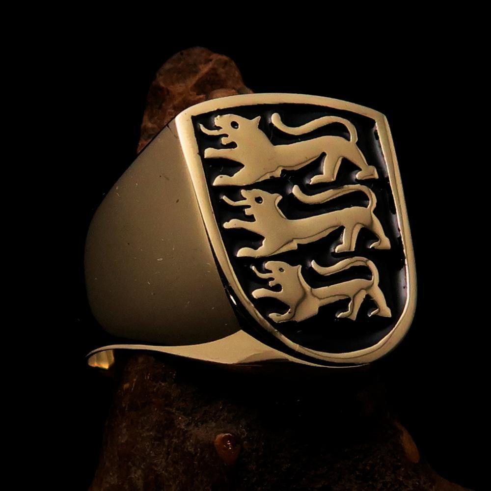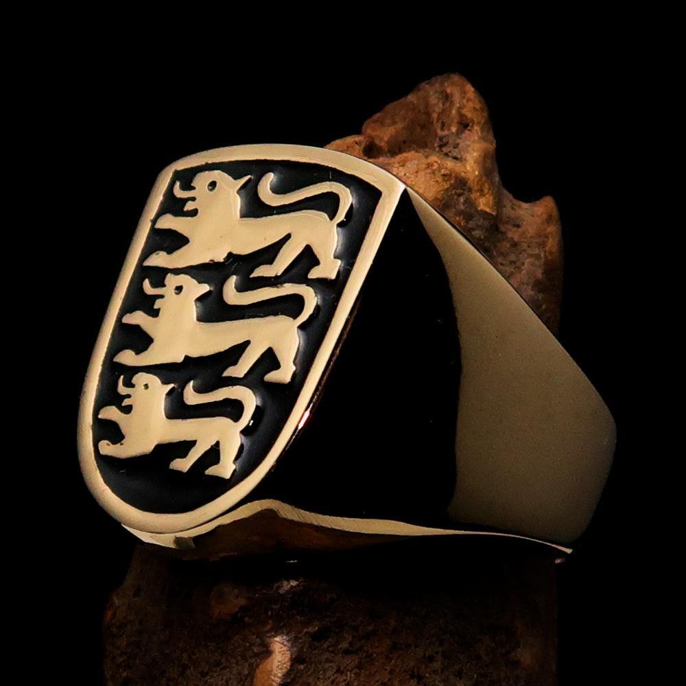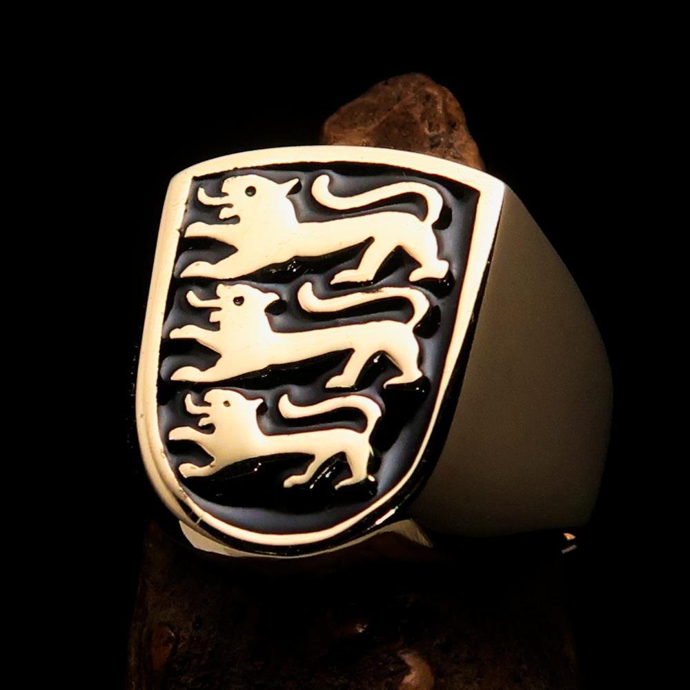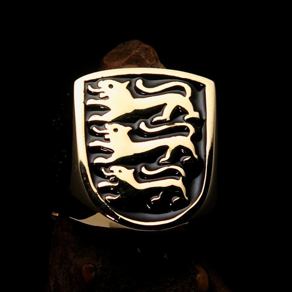 Introducing the Men's Shield Ring 3 Black Lions Coat of Arms, a stunning piece that combines elegance and strength. This ring is not just an accessory; it is a statement of style and sophistication. Crafted from solid brass, it boasts a high polished finish that catches the light beautifully, making it a perfect addition to any man's wardrobe.