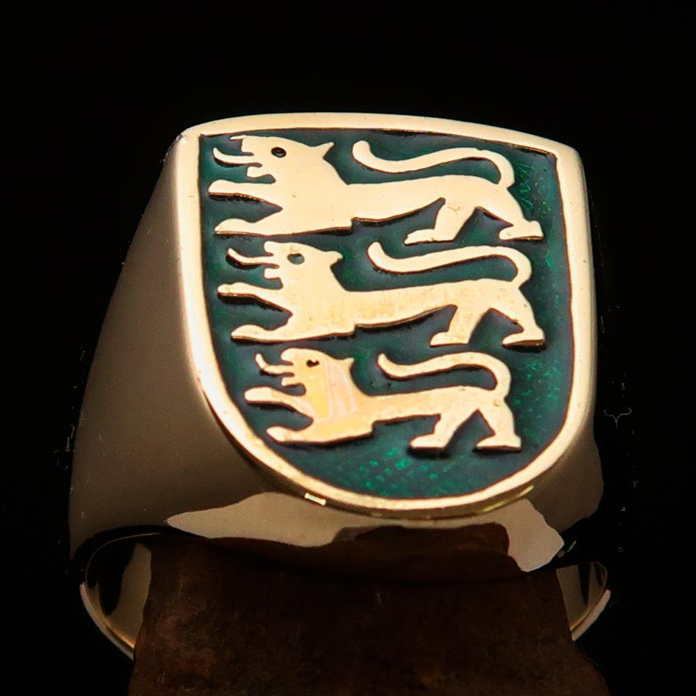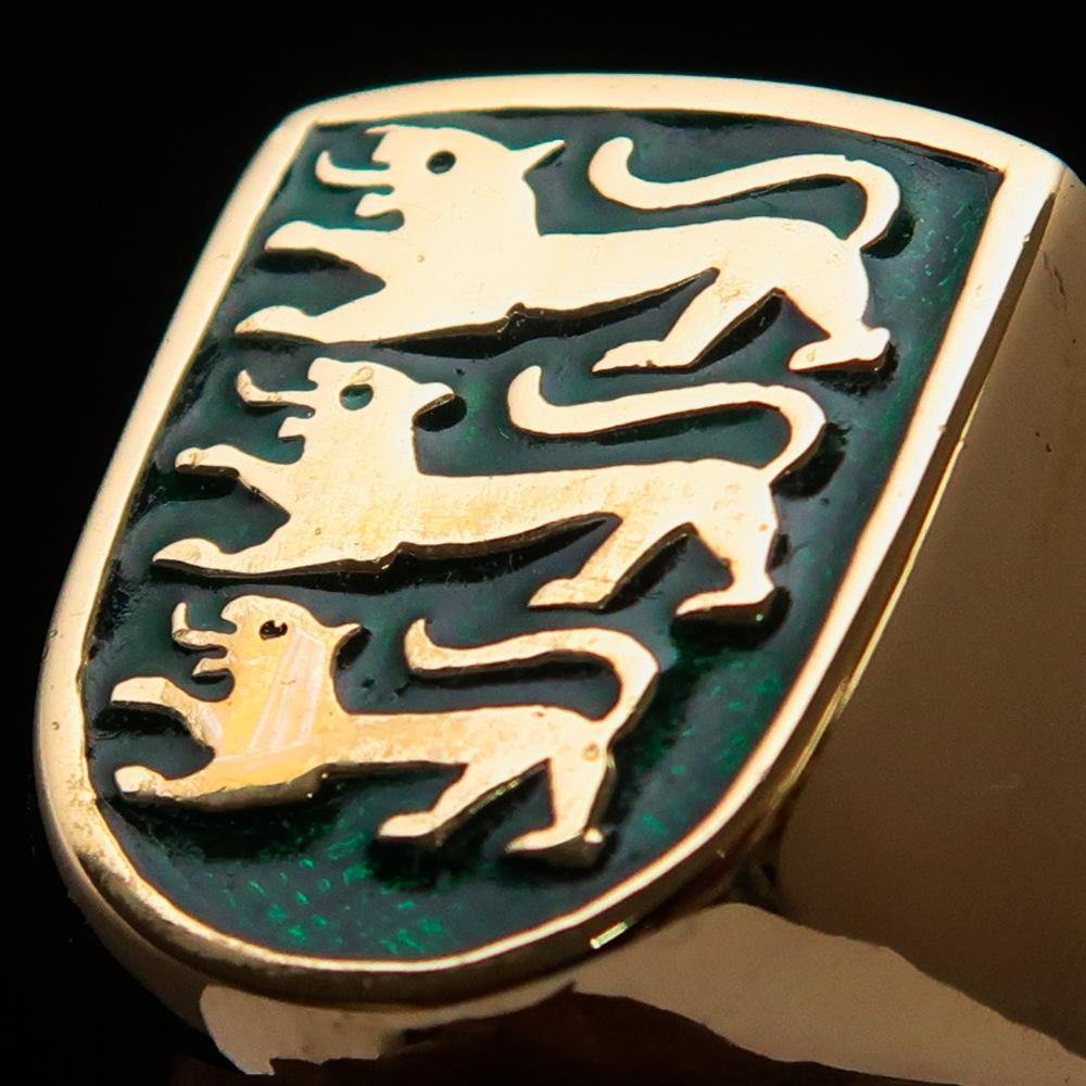 The Perfectly crafted Men's Shield Ring showcases a striking design featuring 3 green lions coat of arms, making it a standout accessory for any man. Made from solid brass, this ring not only offers a bold aesthetic but also ensures durability and longevity, making it a worthwhile addition to your jewelry collection.