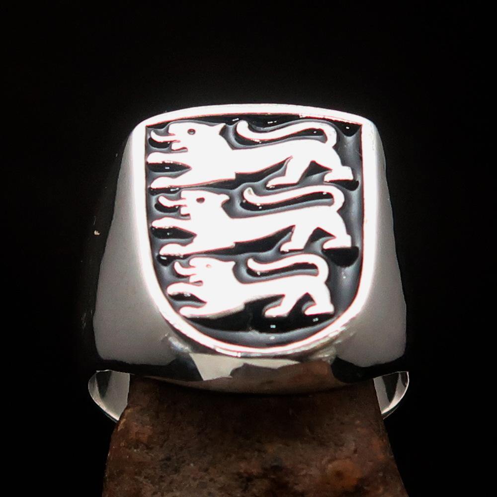 This Men's Shield Ring is a true masterpiece, crafted with precision and attention to detail. Made from solid sterling silver, it features a stunning 3 Lions Coat of Arms design, symbolizing strength and courage. The ring is high polished and coated with black enamel, giving it a sleek and modern look.