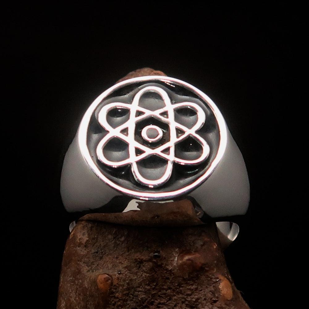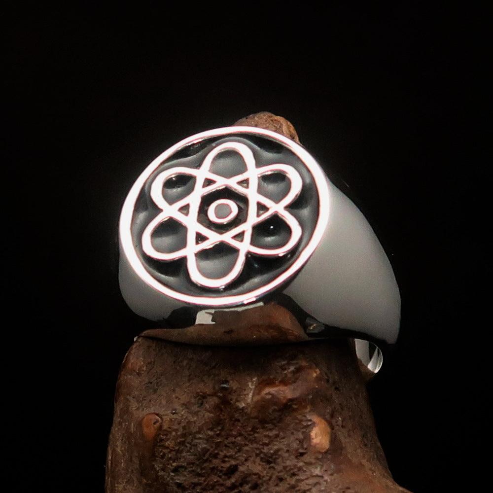 Introducing the Perfectly Crafted Men's Teacher Ring featuring an Atom Symbol, a stunning piece of jewelry designed for educators and science enthusiasts alike. Made from solid sterling silver, this ring is not only durable but also showcases a high-polished finish that gleams beautifully in any light. The striking black enamel accentuates the atom symbol, making it a perfect accessory for those who appreciate both style and meaning.