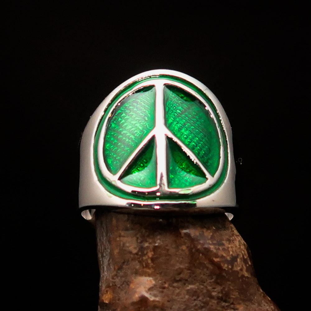This ring is hallmarked 925, ensuring that you are receiving genuine Sterling Silver. The meticulous craftsmanship guarantees durability and a long-lasting shine. The green enamel Peace Symbol is intricately designed, adding a pop of color that stands out beautifully against the silver backdrop.