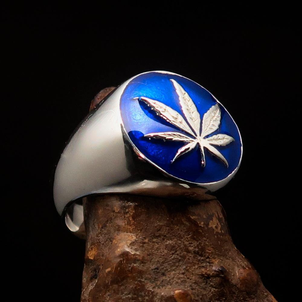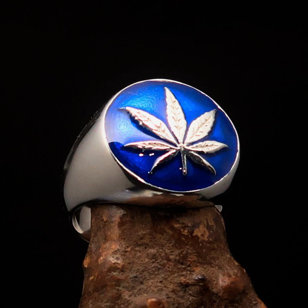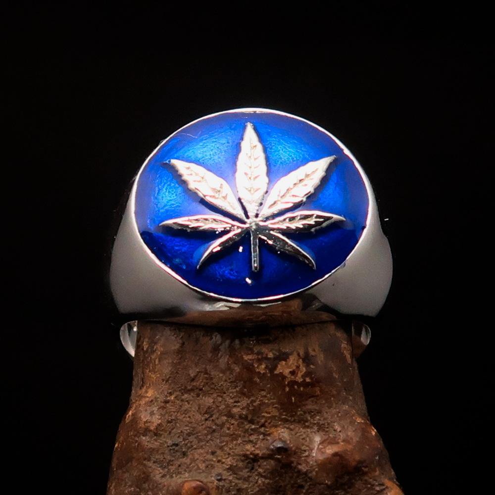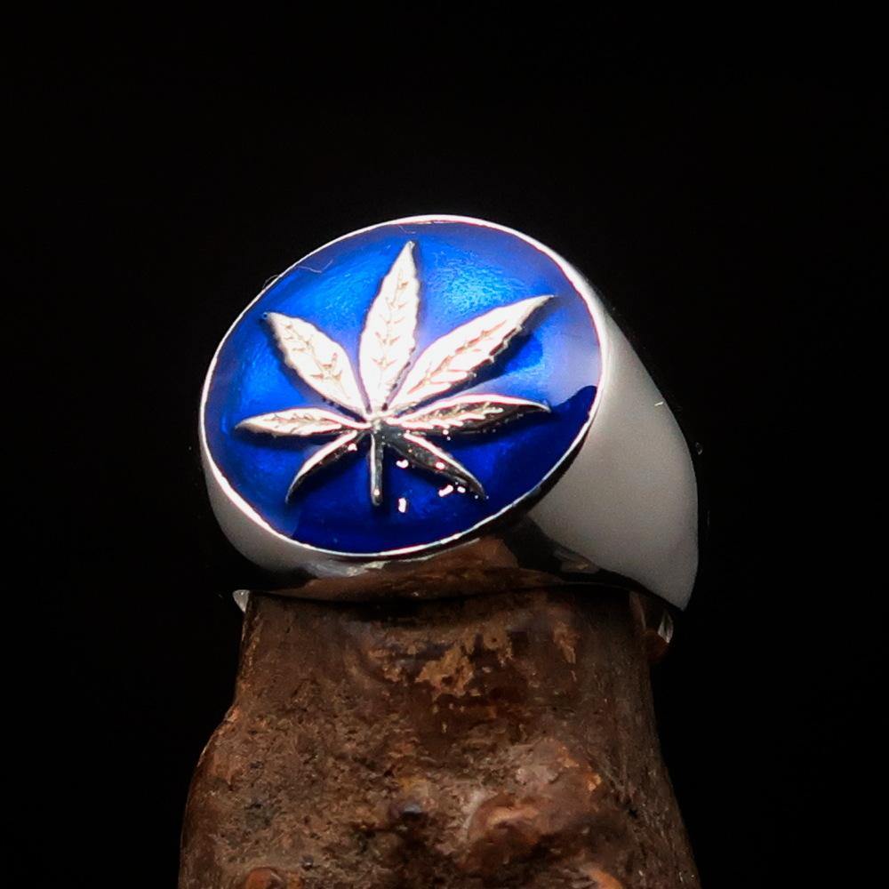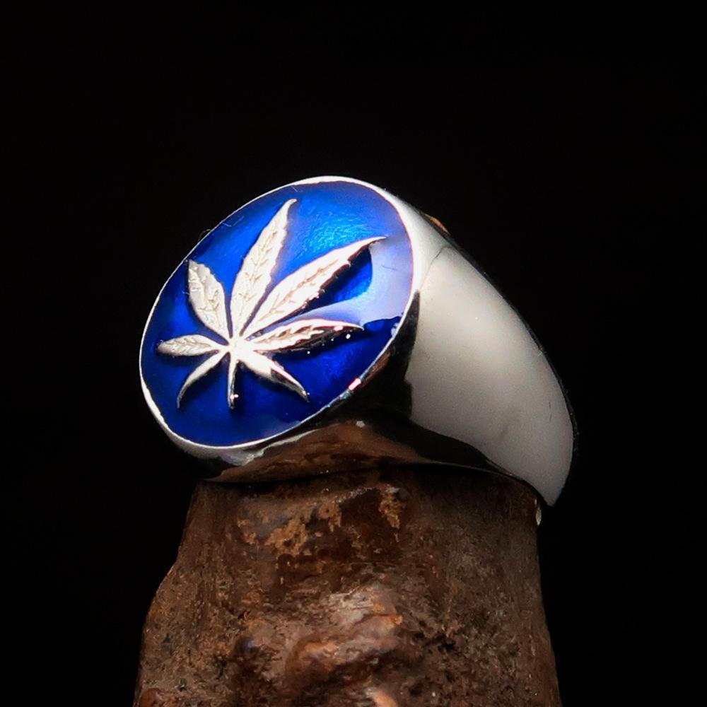 Introducing our exquisite Sterling Silver Men's Ring adorned with a stunning blue Marihuana Cannabis Leaf design. This ring is crafted from solid sterling silver and features a high-polished finish that enhances its beauty and shine. The vibrant blue enamel adds a unique touch, making it a perfect accessory for those who appreciate both style and symbolism.