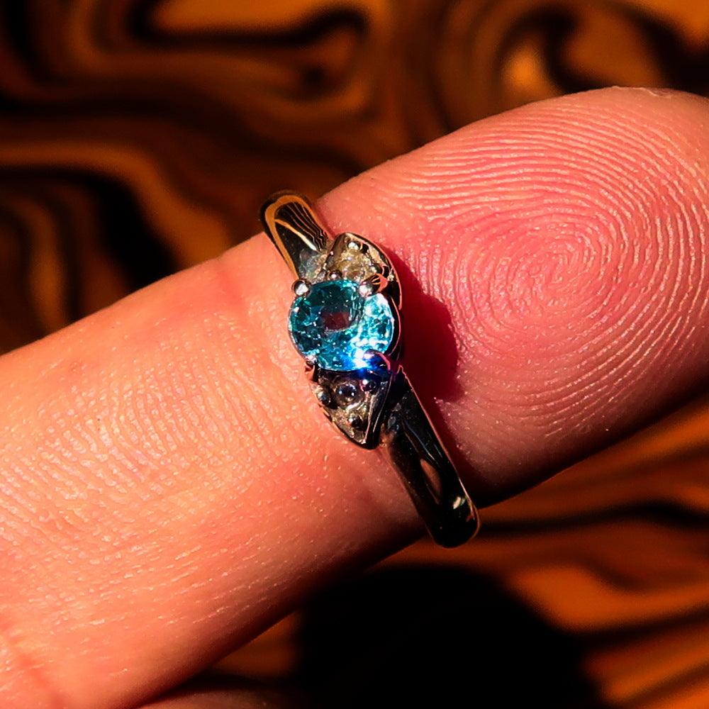 The centerpiece of this ring is the oval cut blue Zircon, measuring 5 mm x 4 mm. Known for its vibrant blue hue and exceptional brilliance, blue Zircon is a popular choice among gemstone enthusiasts. The two white CZ stones add an extra touch of sparkle, enhancing the overall aesthetic of the ring. CZ stones are known for their clarity and brilliance, making them an excellent alternative to diamonds.