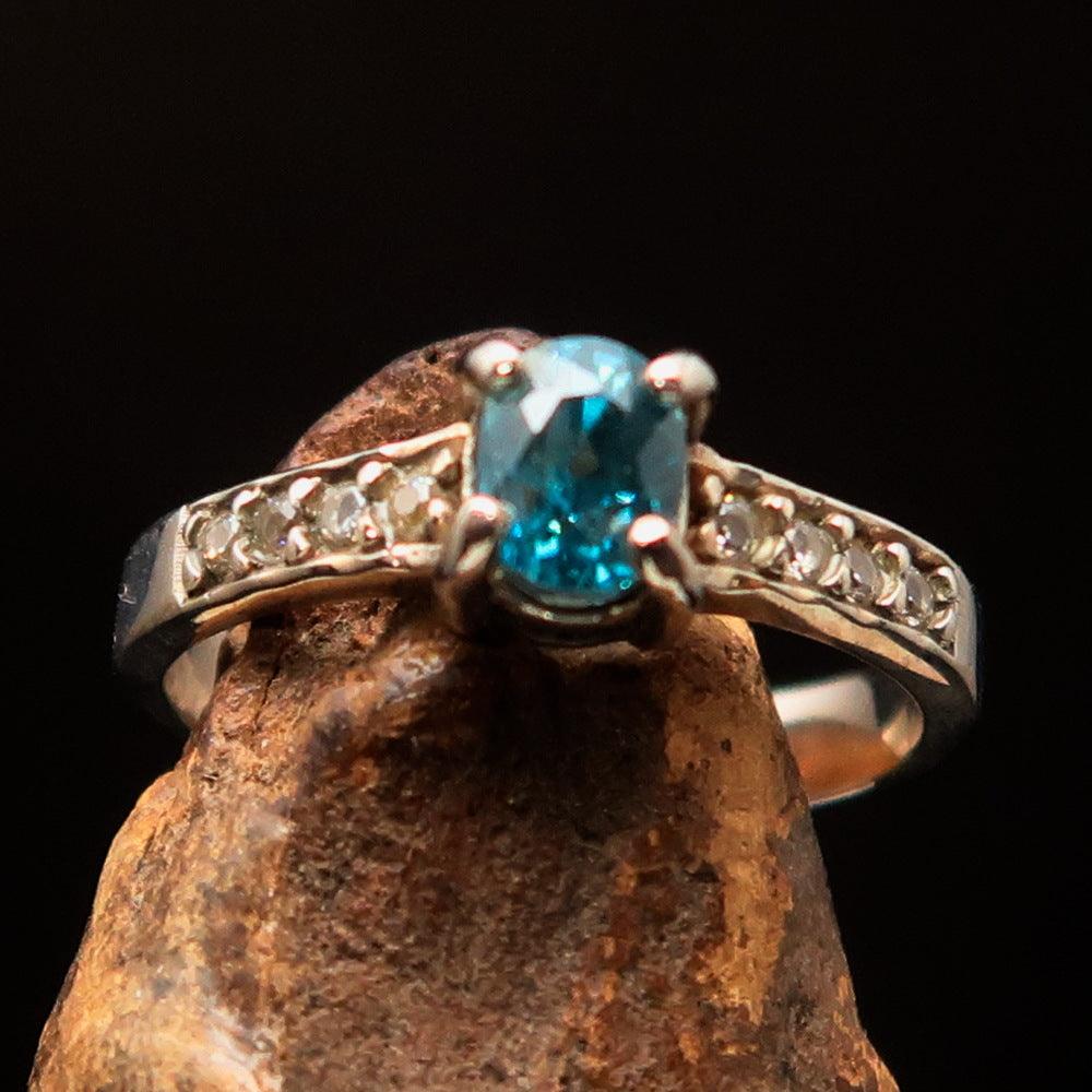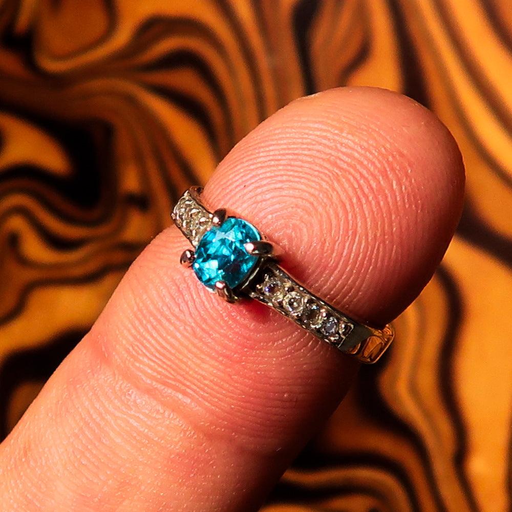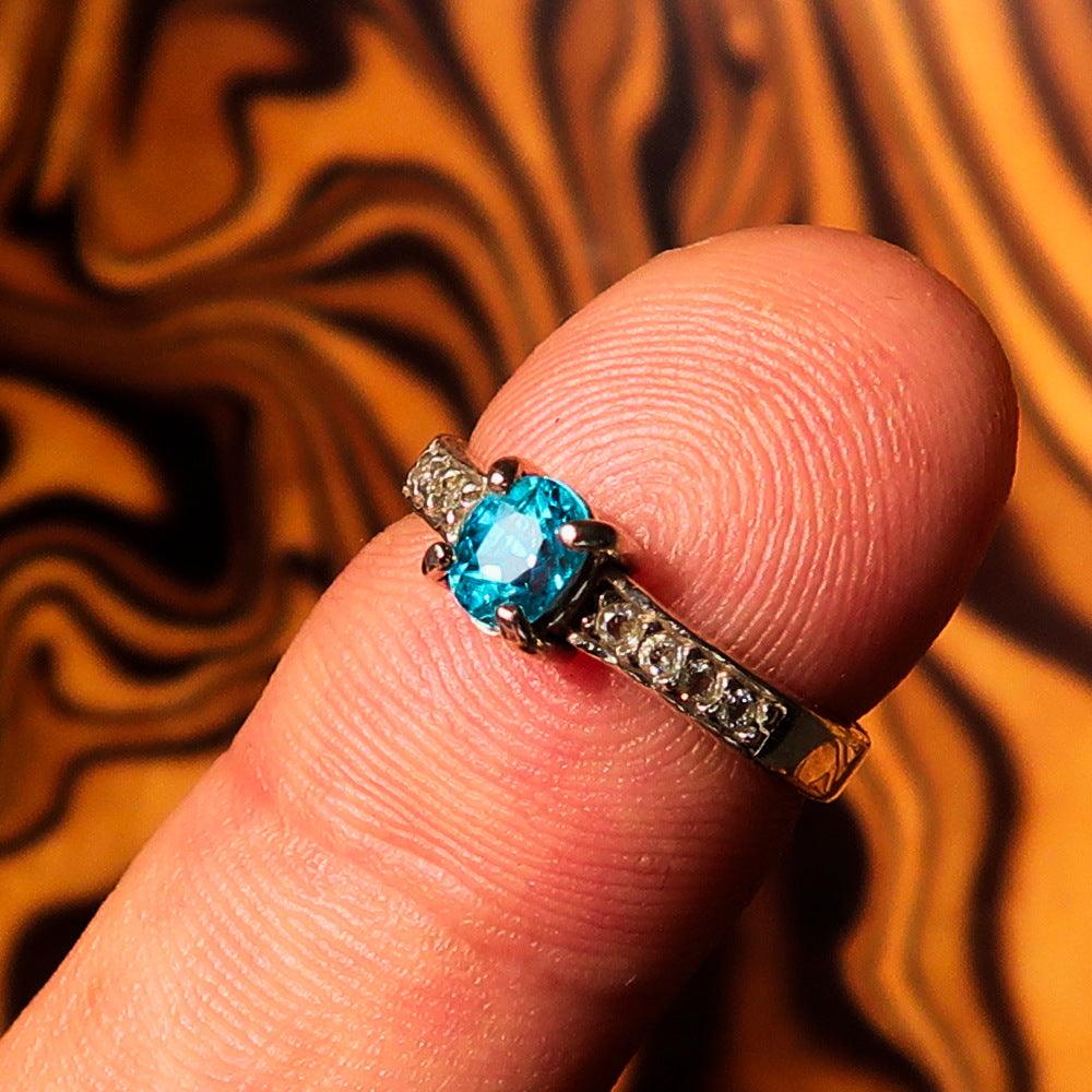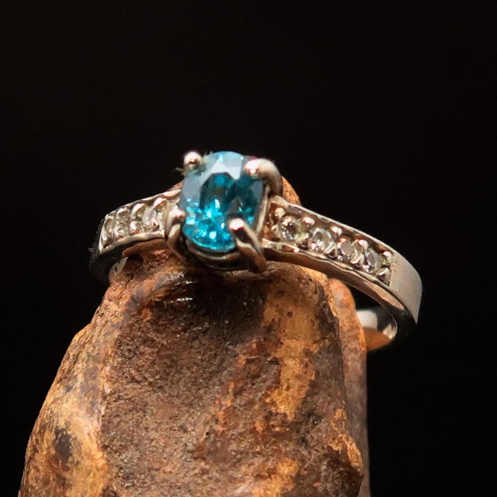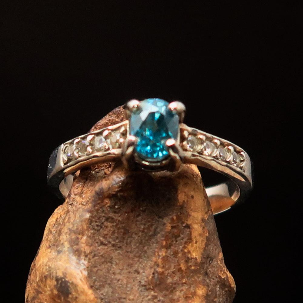 The centerpiece of this ring is the oval cut blue Zircon, measuring 5 mm x 4 mm. Known for its brilliance and fire, blue Zircon is a popular choice among gemstone enthusiasts. The vibrant blue hue of the Zircon is beautifully accentuated by the surrounding CZ stones, which add an extra layer of sparkle and glamour.