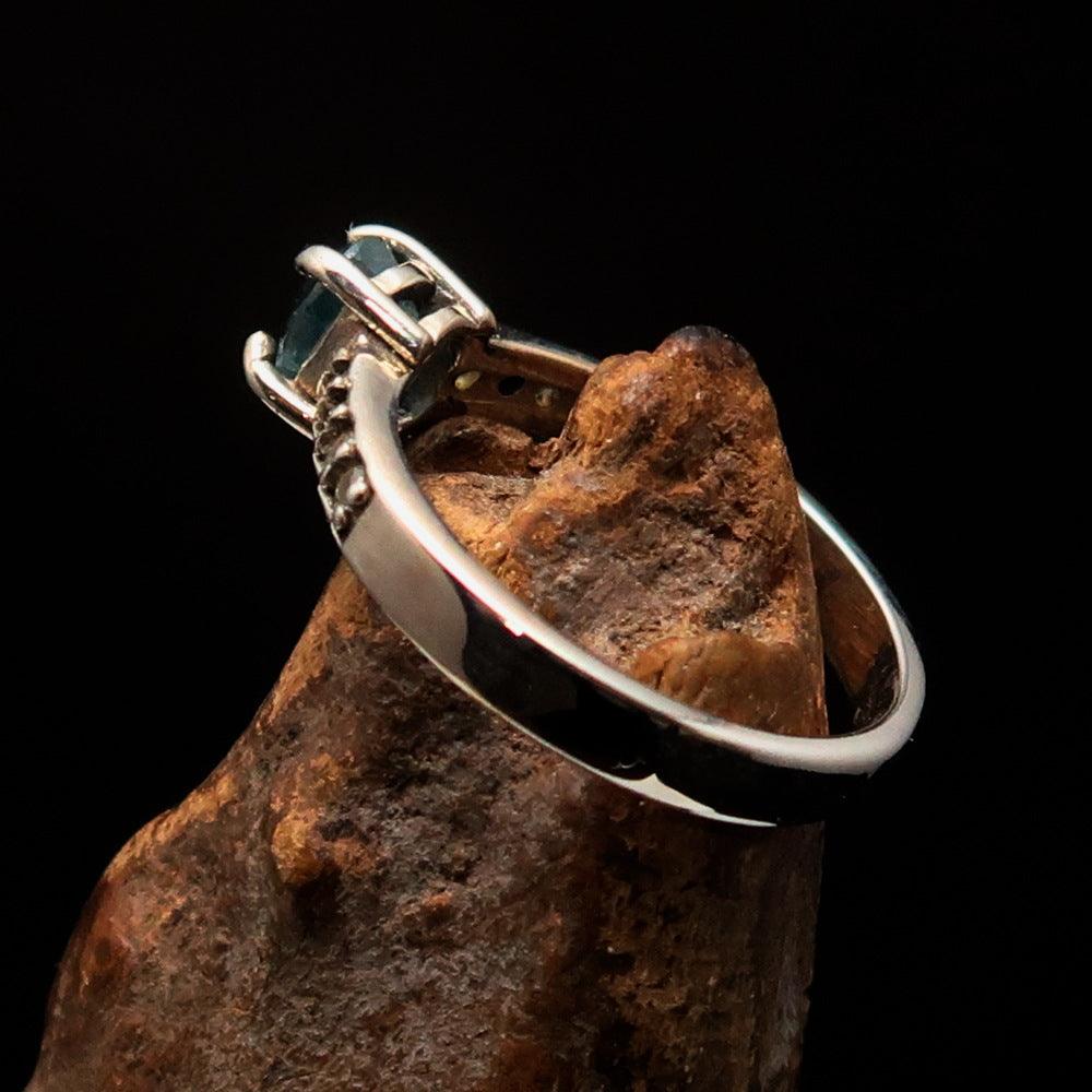 Introducing our exquisite Sterling Silver Solitaire Band Ring, a stunning piece of jewelry that combines elegance and sophistication. This ring features a captivating oval cut blue Zircon, complemented by eight dazzling white cubic zirconia (CZ) stones. The mirror-polished finish of the sterling silver enhances the beauty of the gemstones, making it a perfect accessory for any occasion.