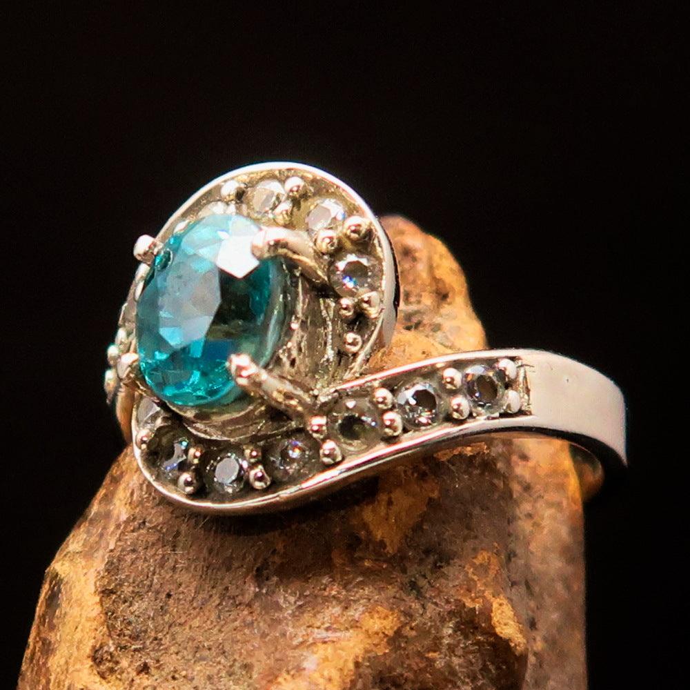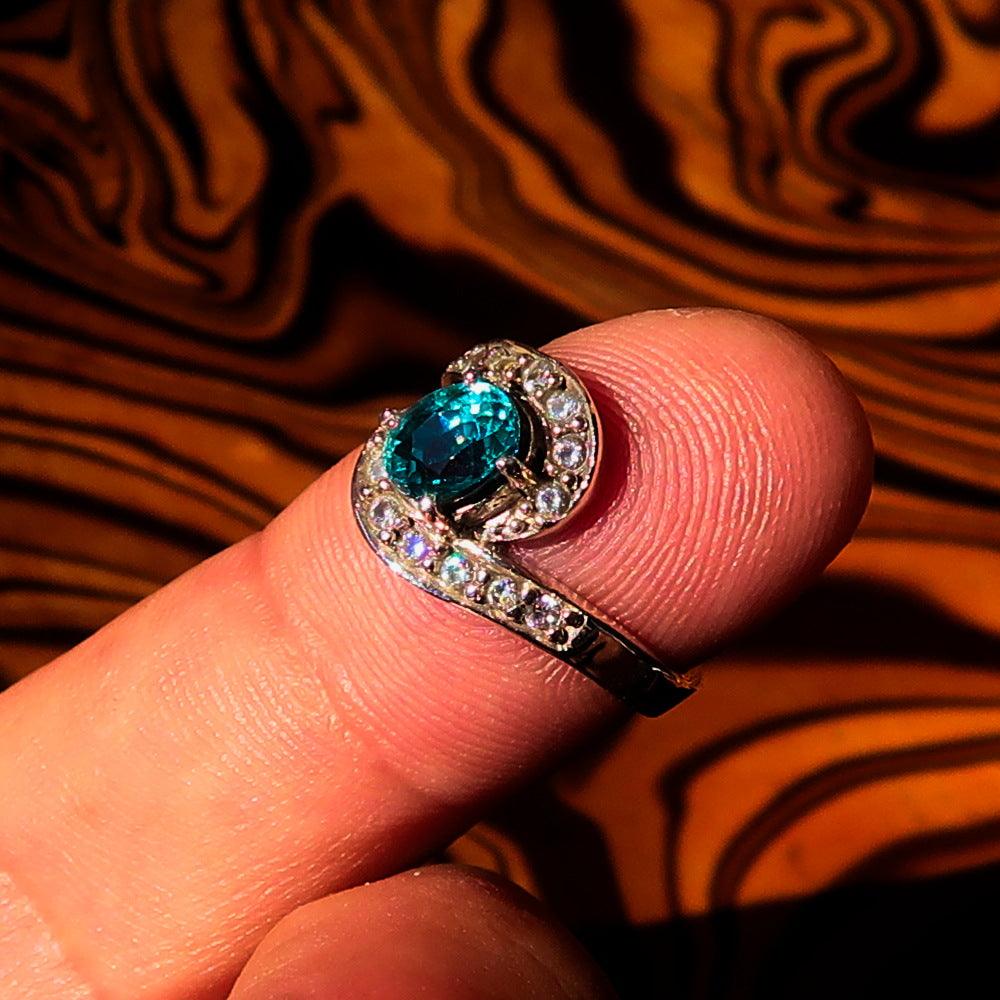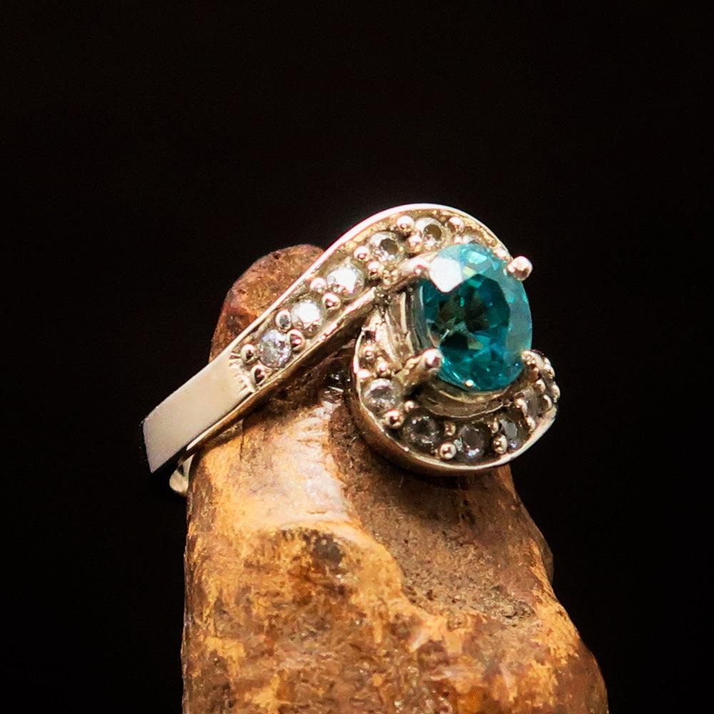 Blue Zircon is a popular gemstone known for its stunning color and brilliance. It is often confused with cubic zirconia, but it is a natural gemstone that has been cherished for centuries. The vibrant blue color of the zircon in this ring is reminiscent of the ocean, making it a perfect choice for those who love nature-inspired jewelry. Additionally, zircon is believed to have protective properties and is associated with wisdom and prosperity.