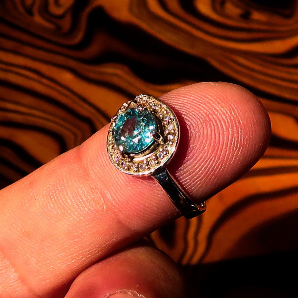 The mirror-polished finish of this ring enhances its overall appeal, making it a standout piece in any jewelry collection. The round cut Blue Zircon measures 7 mm x 7 mm, providing a striking focal point that draws attention. Surrounding the central stone are 23 sparkling white cubic zirconia (CZ) stones, adding extra sparkle and glamour to the design.
