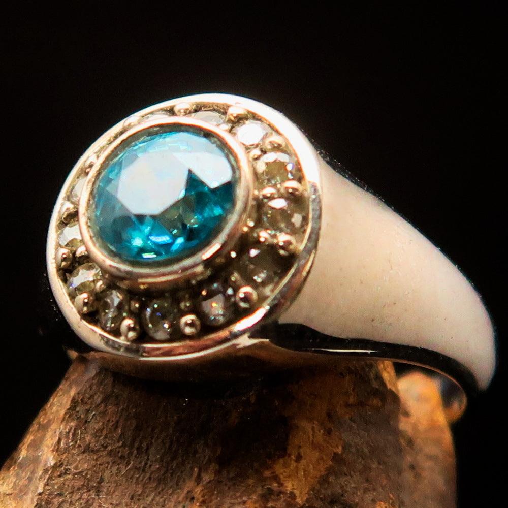The centerpiece of this ring is a magnificent round cut Blue Zircon, measuring 6 mm x 6 mm. Known for its vibrant blue hue and exceptional brilliance, Blue Zircon is a popular choice for those who appreciate unique gemstones. This ring is perfect for those who want to stand out and make a lasting impression.