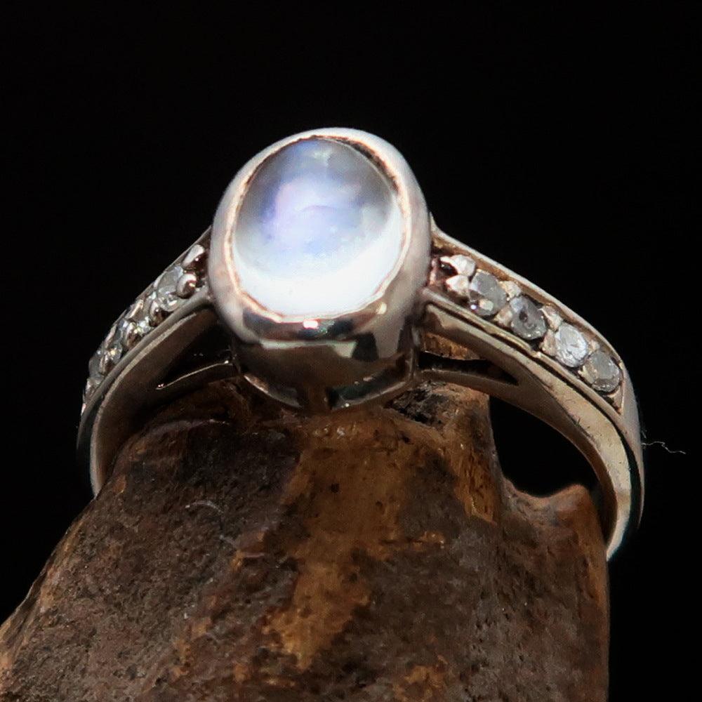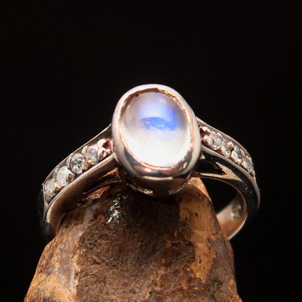 The centerpiece of this ring is the oval-shaped Moonstone, measuring 7 mm x 5 mm. Moonstone is a popular gemstone known for its ethereal glow and mesmerizing color play, often displaying shades of blue, white, and gray. This gemstone is believed to bring good fortune and enhance intuition, making it a meaningful addition to your jewelry collection.