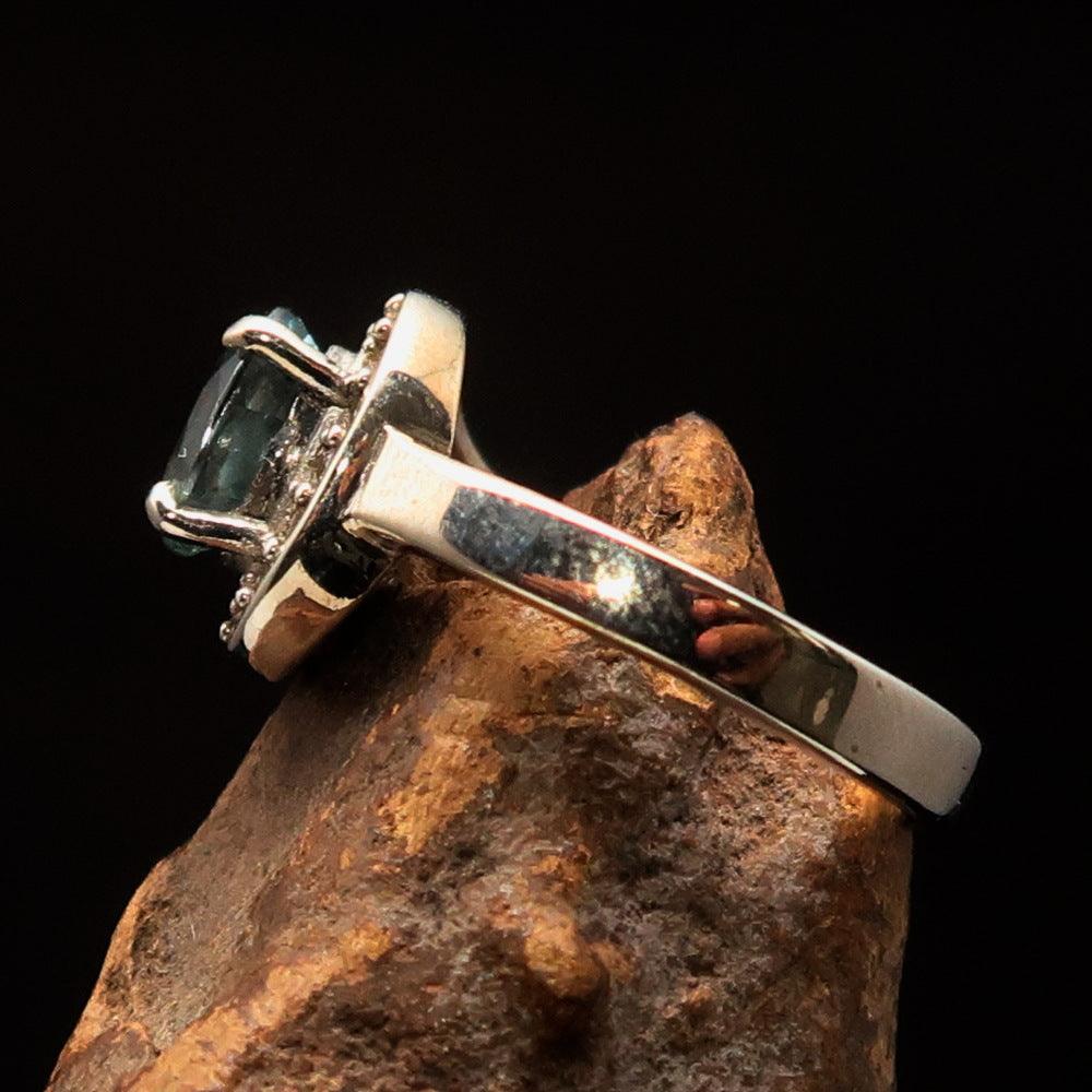 The design of the Sterling Silver Solitaire Loop Ring is both timeless and contemporary. The oval cut Blue Zircon, measuring 7 mm x 6 mm, is the centerpiece of this ring, surrounded by 21 sparkling white cubic zirconia (CZ) stones that enhance its overall allure. The combination of the rich blue and the shimmering white stones creates a striking contrast that is sure to turn heads. Each stone is carefully set to ensure maximum brilliance and security, making this ring not only beautiful but also practical for everyday wear.