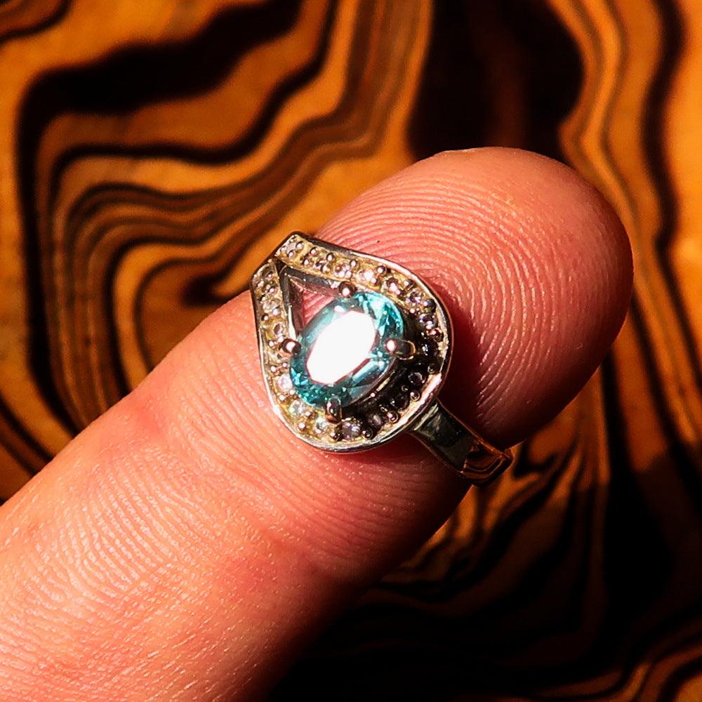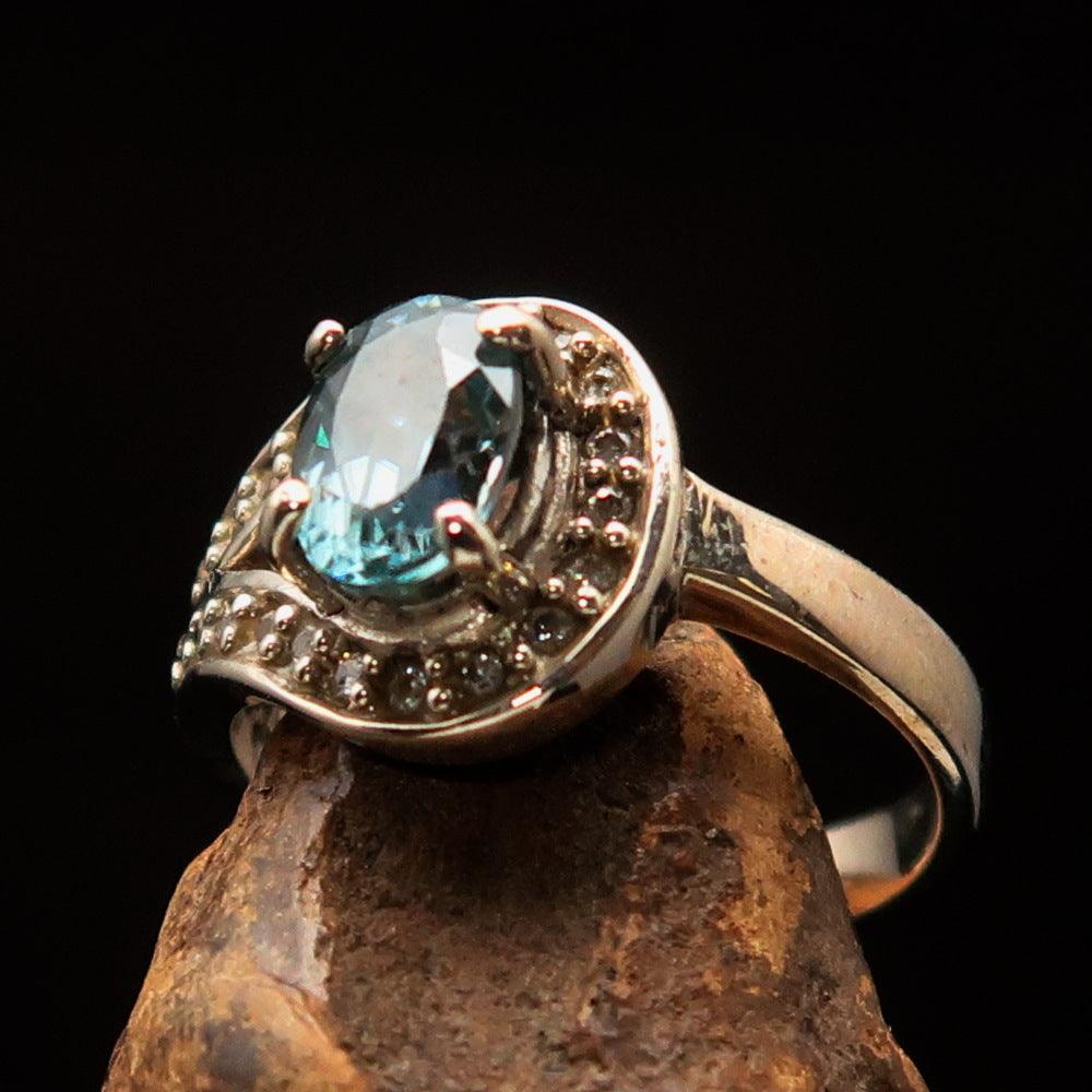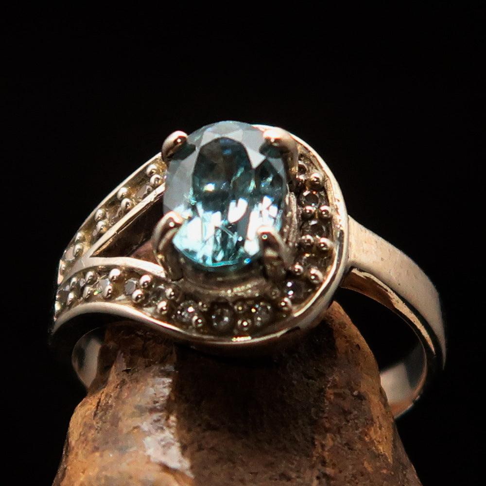 Sterling Silver Solitaire Loop Ring featuring an oval cut Blue Zircon and 21 white CZ stones, hallmarked 925.