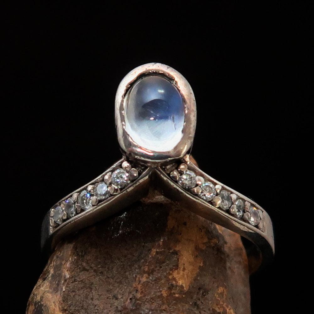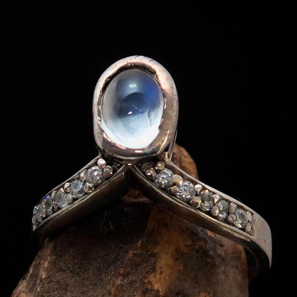 The oval cut moonstone measures 7 mm x 6 mm, showcasing its natural beauty and brilliance. The mirror-polished surface of the sterling silver enhances the overall aesthetic, reflecting light beautifully and adding a touch of sophistication to your look. Whether you're dressing up for a special occasion or adding a touch of elegance to your everyday outfit, this ring is versatile enough to suit any style.