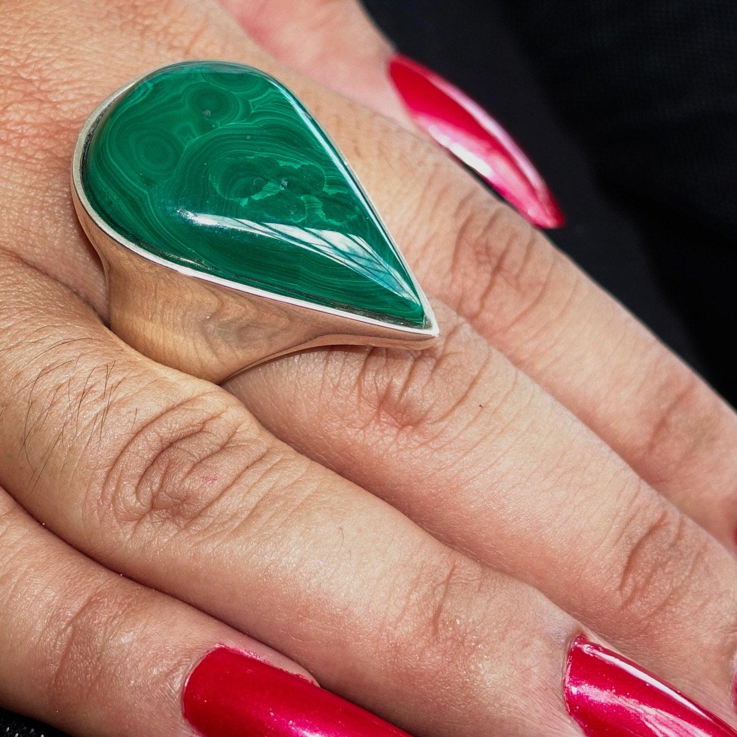 The ring measures 35 mm along the finger and 29 mm wide, making it a comfortable fit for those who wear a US Size 10. Its unique tear shape adds a touch of modern elegance, while the malachite stone serves as a captivating focal point. Whether you're dressing up for a special event or looking for a statement piece for everyday wear, this ring is versatile enough to suit any style.