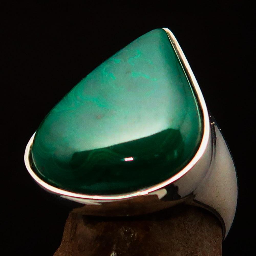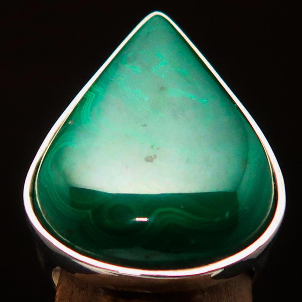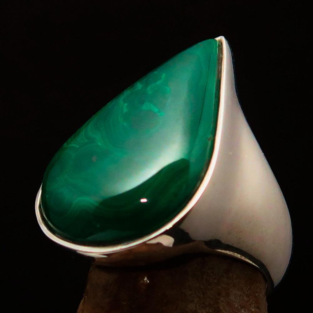 Tear shaped mirror polished sterling silver ring featuring a pear-shaped green malachite stone, showcasing its elegant design.