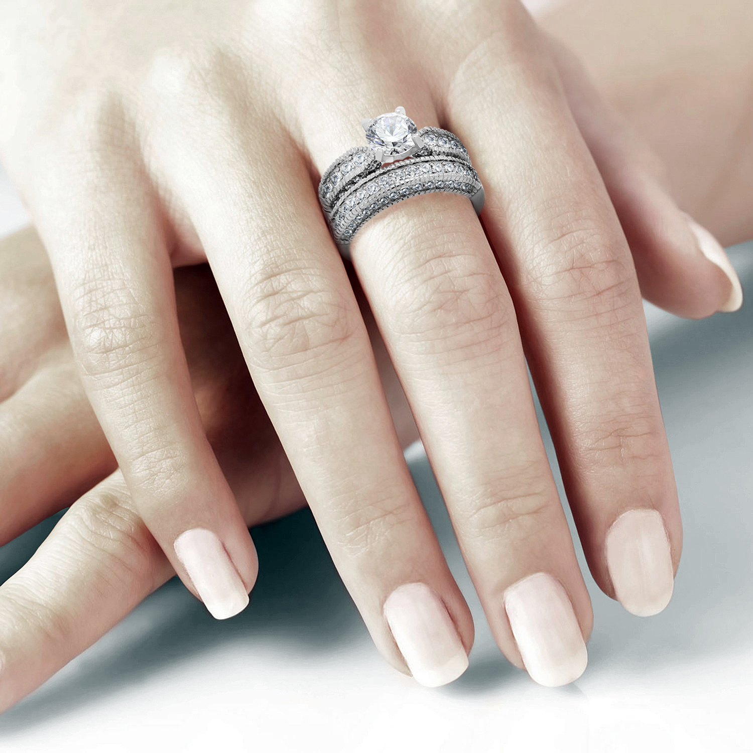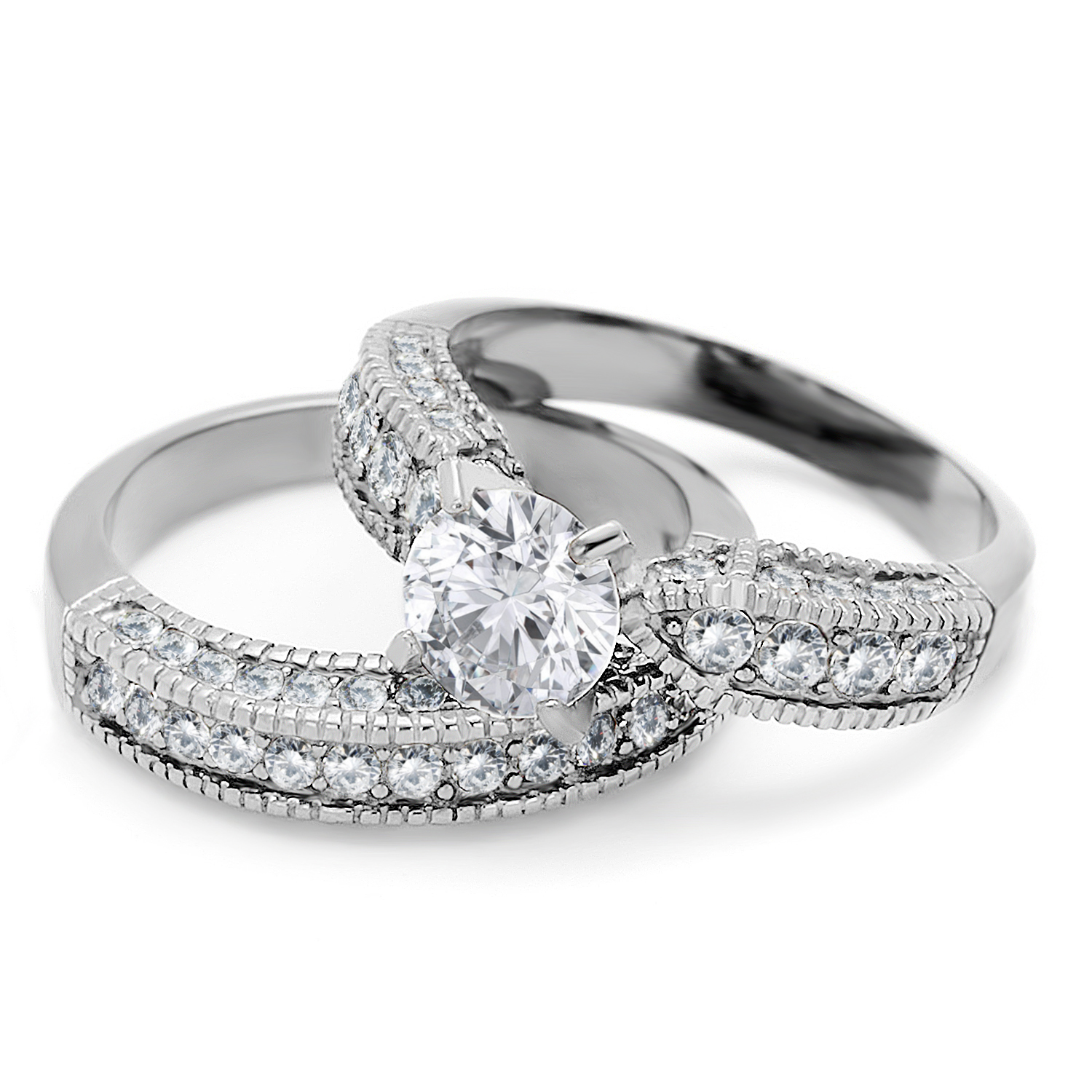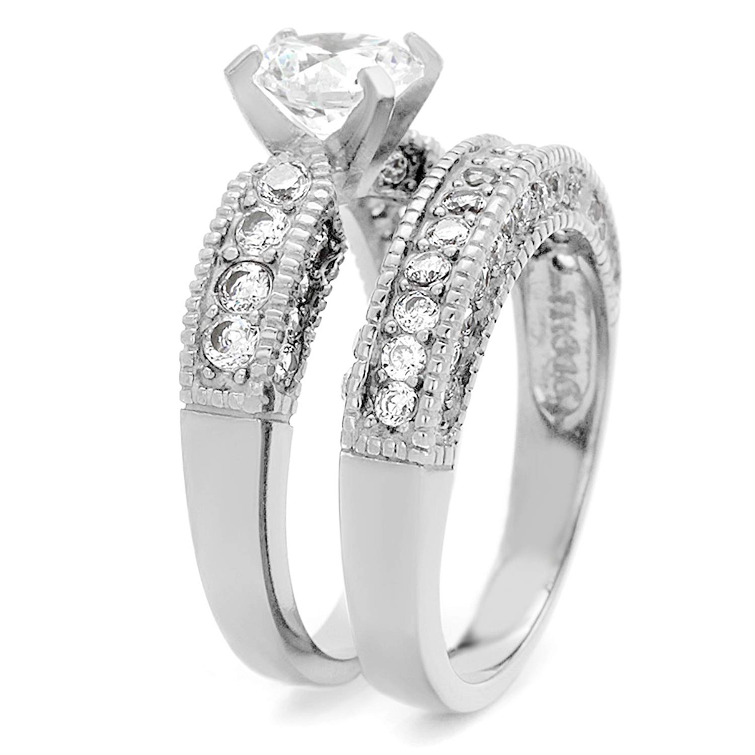 The engagement ring showcases a brilliant round cut cubic zirconia center stone, measuring 7mm wide and equivalent to 1.28 carats. This captivating centerpiece is surrounded by a beautifully crafted band that enhances its vintage charm. The matching wedding band is adorned with 44 round cut AAA grade cubic zirconia stones, ensuring that both rings shine brightly together or can be worn individually for a more understated look.