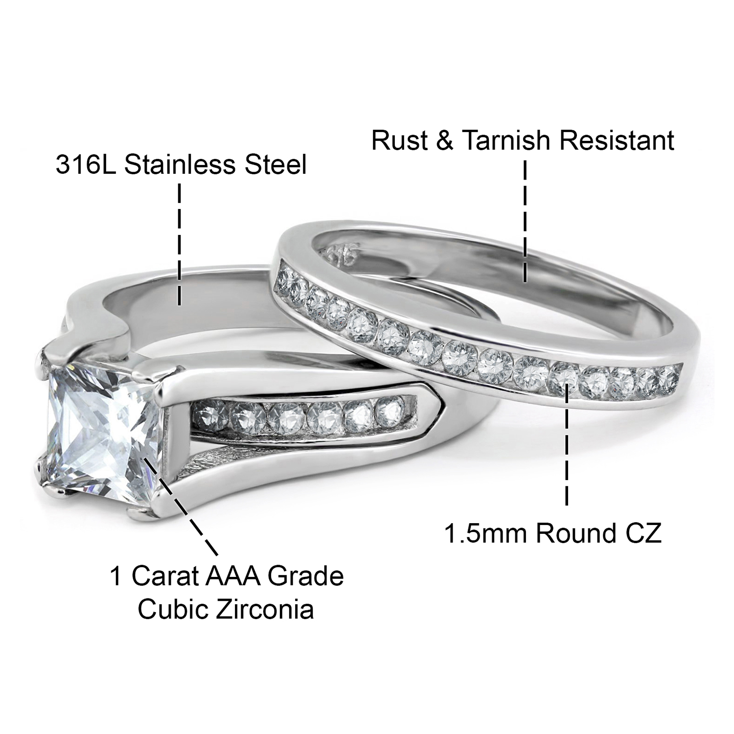 One of the standout features of our Women Stainless Steel Bridal Sets is the use of 316L stainless steel. This material is known for its strength and resistance to tarnishing, making it an ideal choice for wedding rings that will be worn every day. The high polishing technique used in crafting these rings gives them a unique characteristic, providing an everlasting color and shine that will keep your rings looking new for years to come.