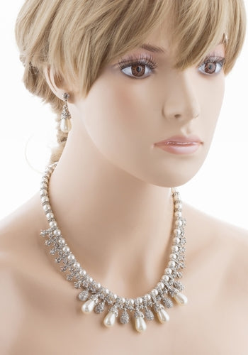 The earrings included in this set are designed to match perfectly with the necklace, featuring a drop length of approximately 1.1 inches and a width of 0.3 inches. The post back closure ensures they stay securely in place, adding a touch of sparkle to your bridal look. The dangling teardrop pearls create a graceful movement, catching the light beautifully as you move.