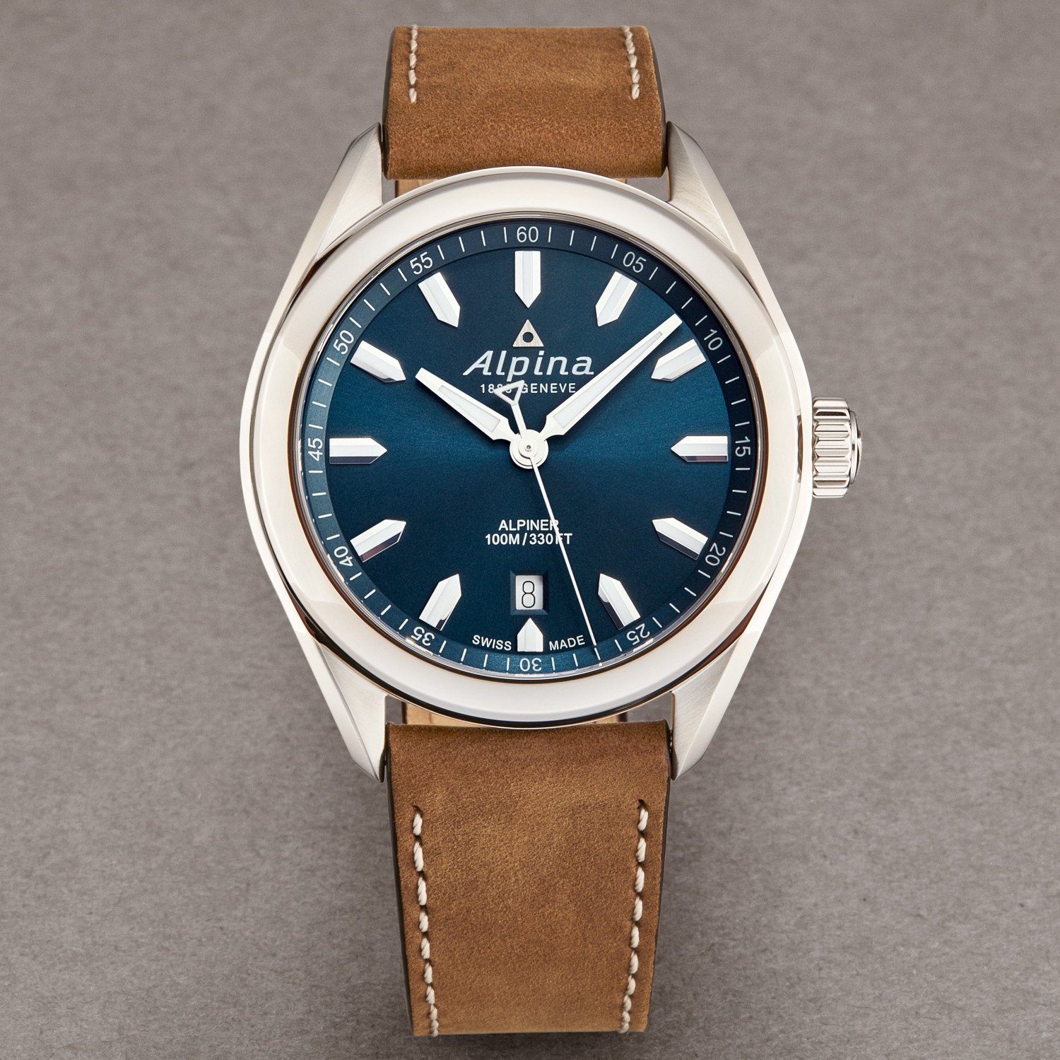 Alpina Men's AL240NS4E6 'Alpiner' watch featuring a blue dial and brown leather strap, showcasing its elegant design and Swiss craftsmanship.
