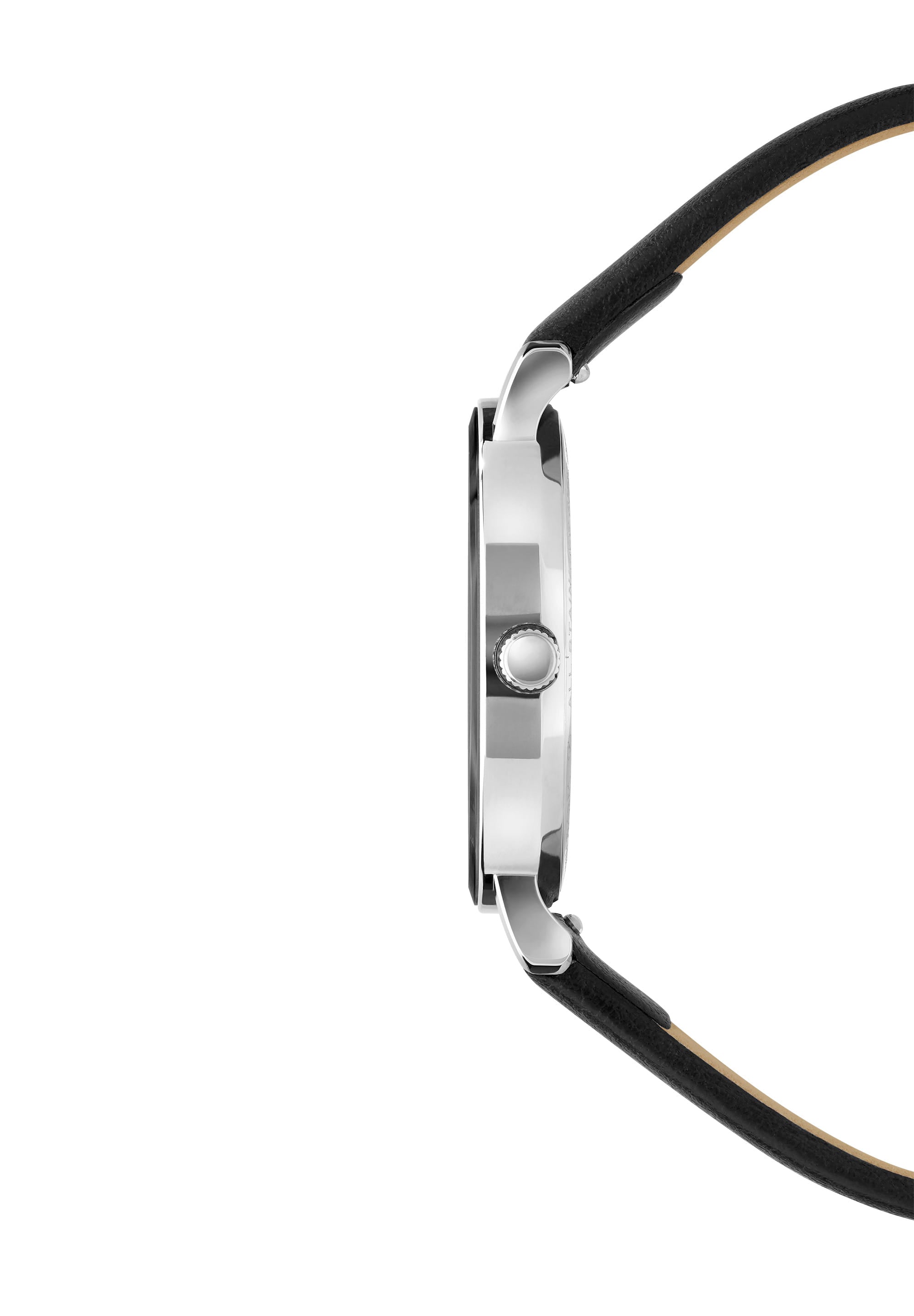 The black genuine leather strap is designed for comfort, securely attached to the 30mm stainless steel case. The strap is made from high-quality Italian leather, ensuring durability and a luxurious feel on your wrist. With a band width of 15 mm, it fits comfortably on a wrist circumference of 145-185 mm, making it suitable for a variety of wrist sizes.