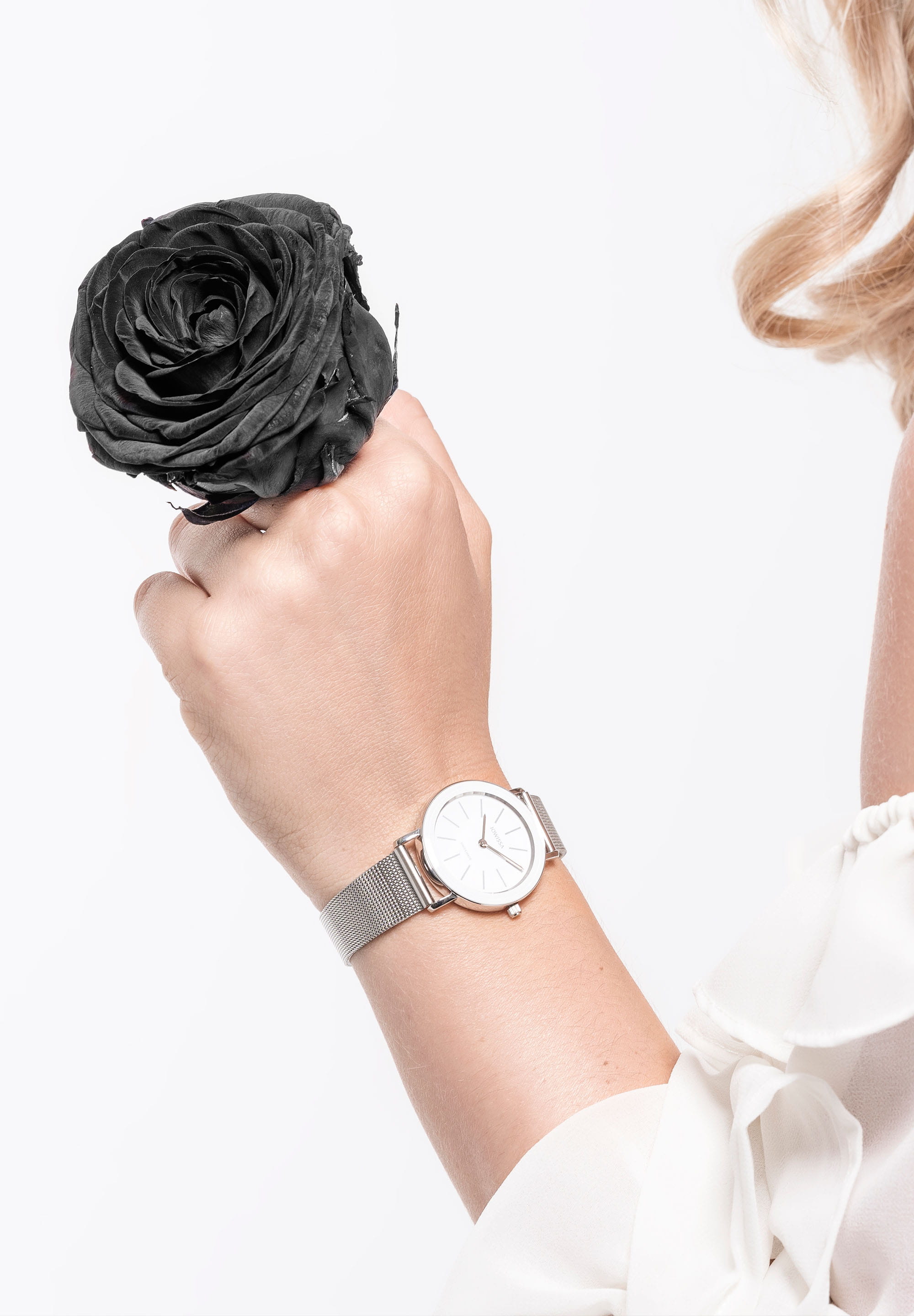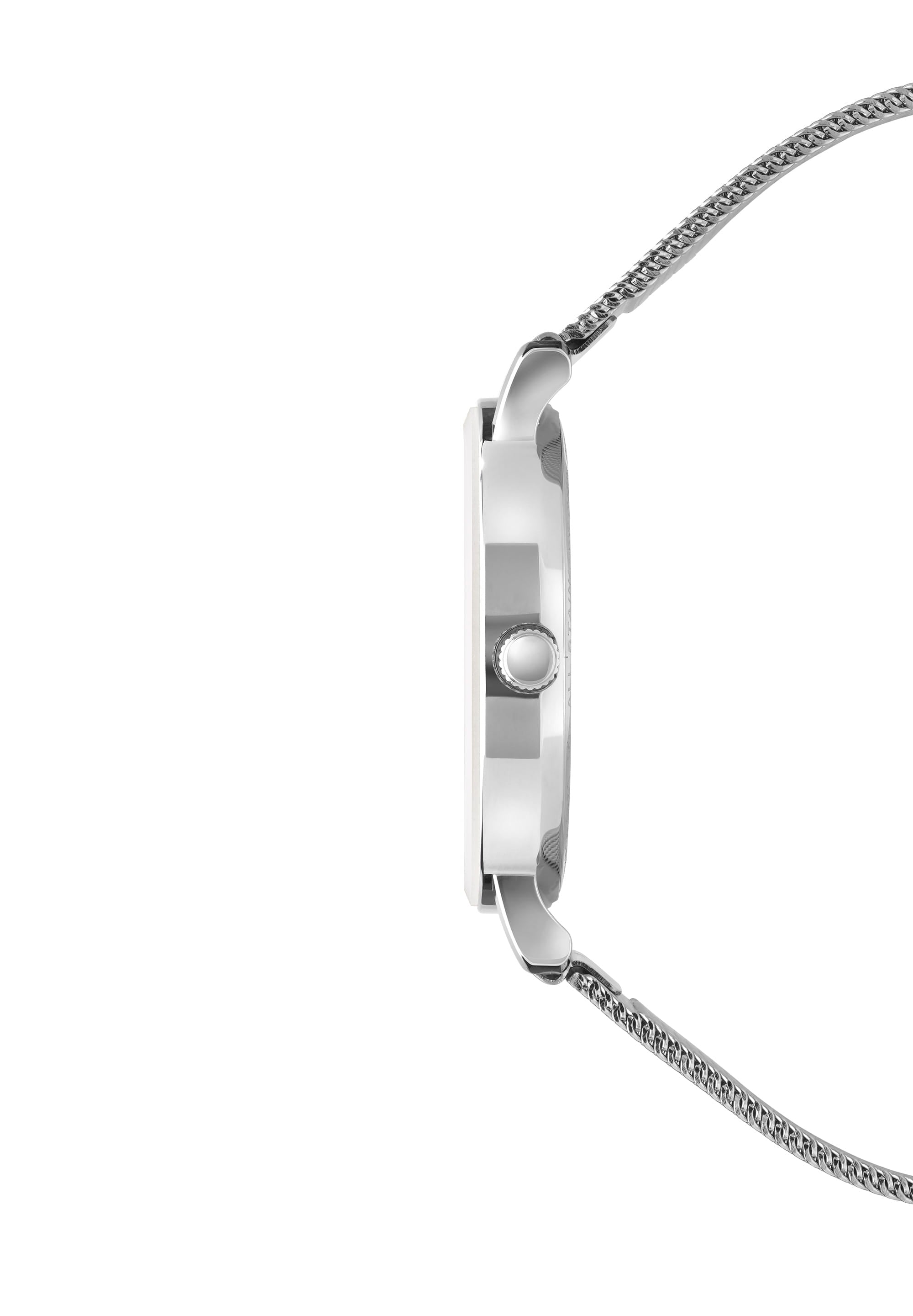 The watch features a clean white dial that beautifully contrasts with the silver mesh band, creating a sophisticated look. The 30mm stainless steel case is gloss polished, adding a touch of shine to your wrist. The metallized bezel is integrated into the glass, enhancing the overall elegance of the watch.