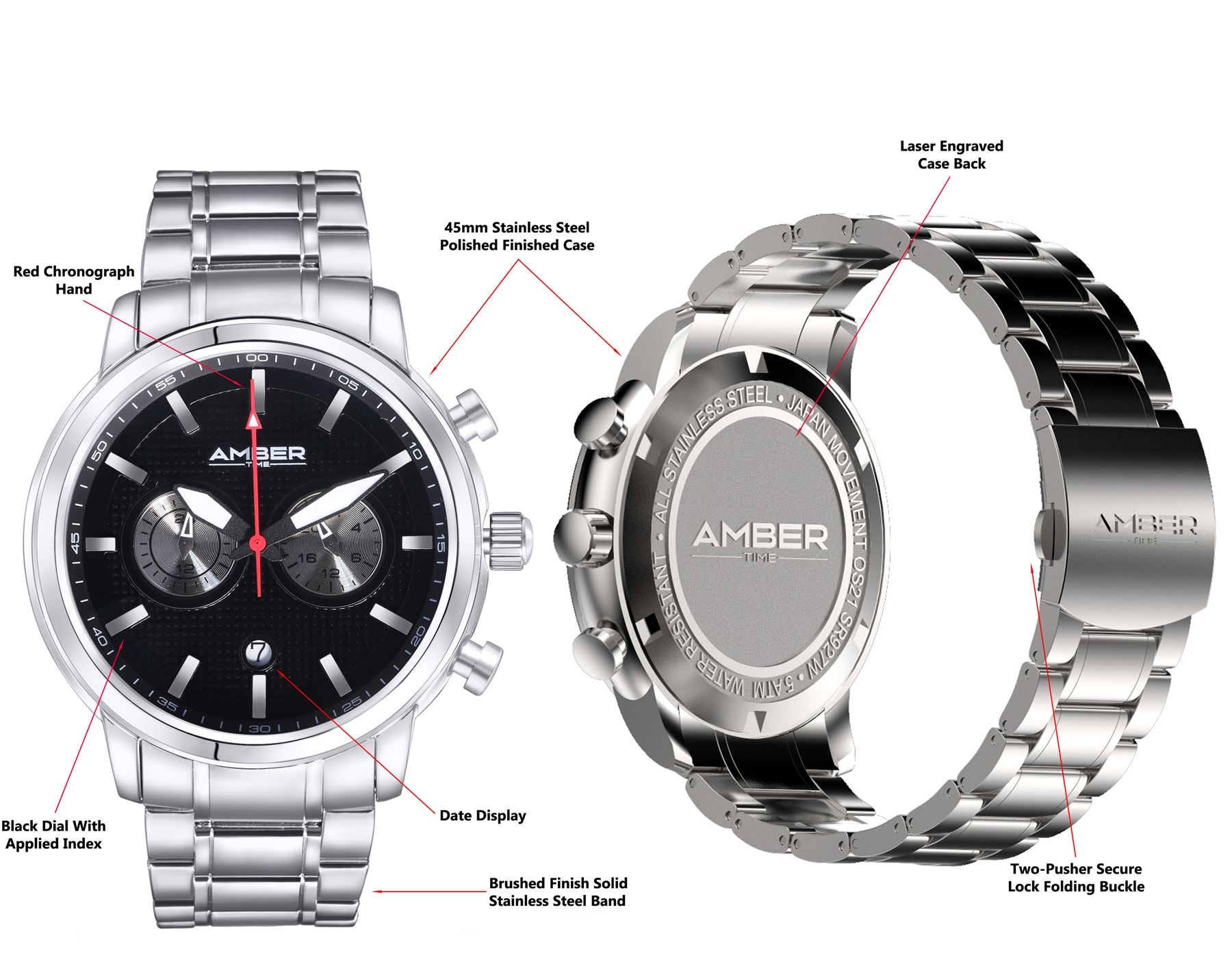 Here are some key specifications of the Amber Time Men's Quartz Chronograph Watch:
