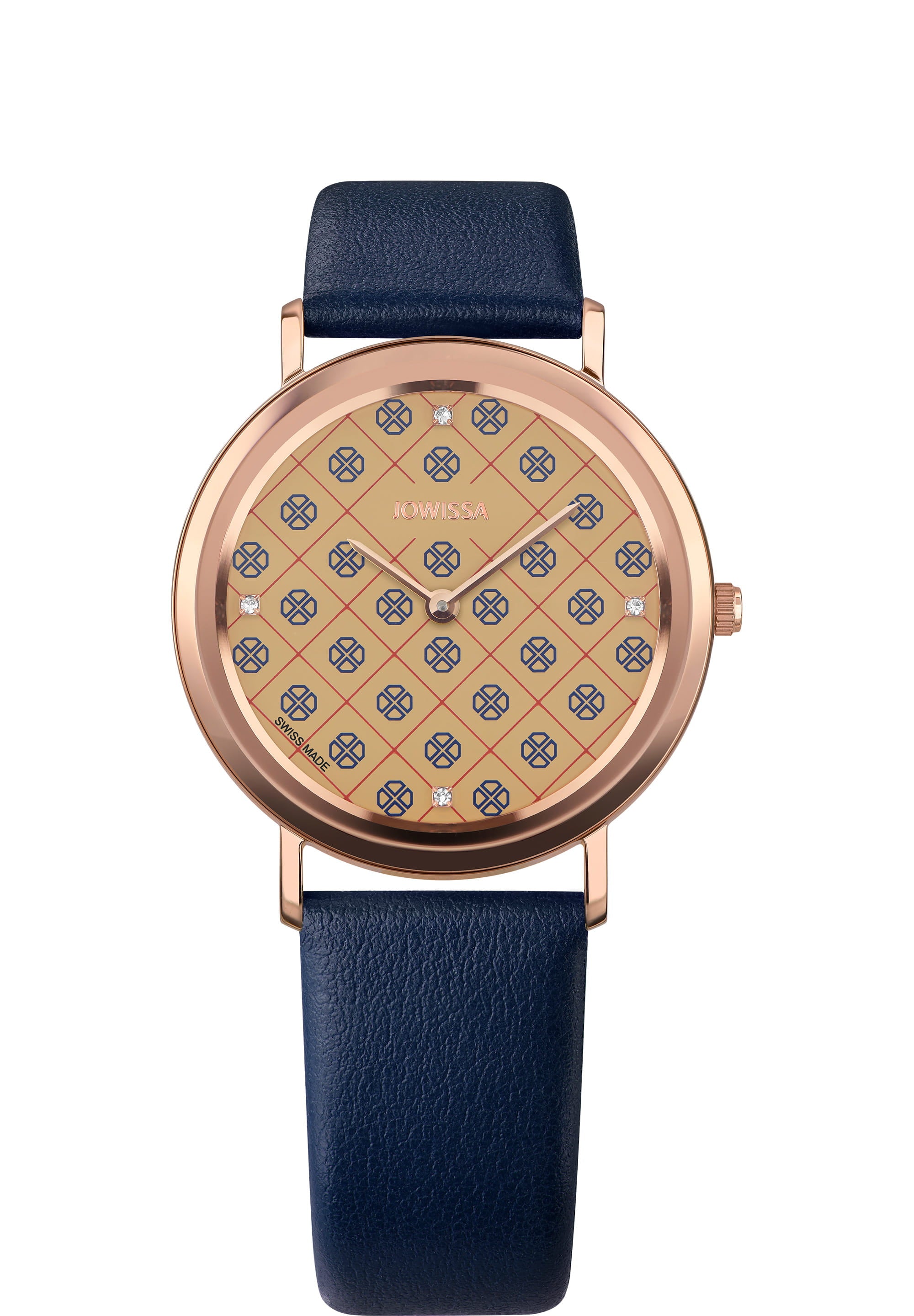 AnWy Swiss Ladies Watch J6.223.L featuring a gold-beige dial with navy logo pattern, stainless steel case, and genuine leather strap.