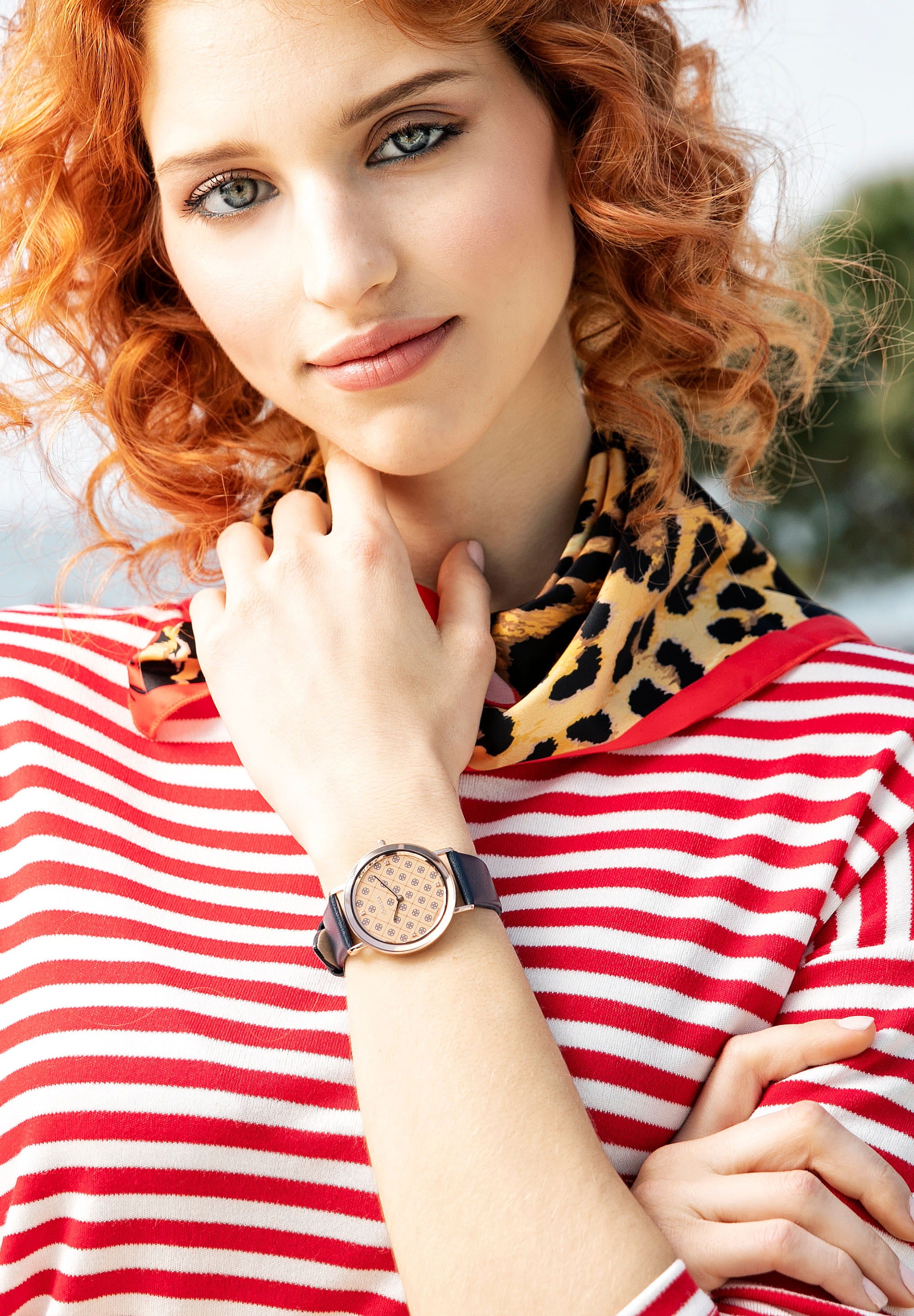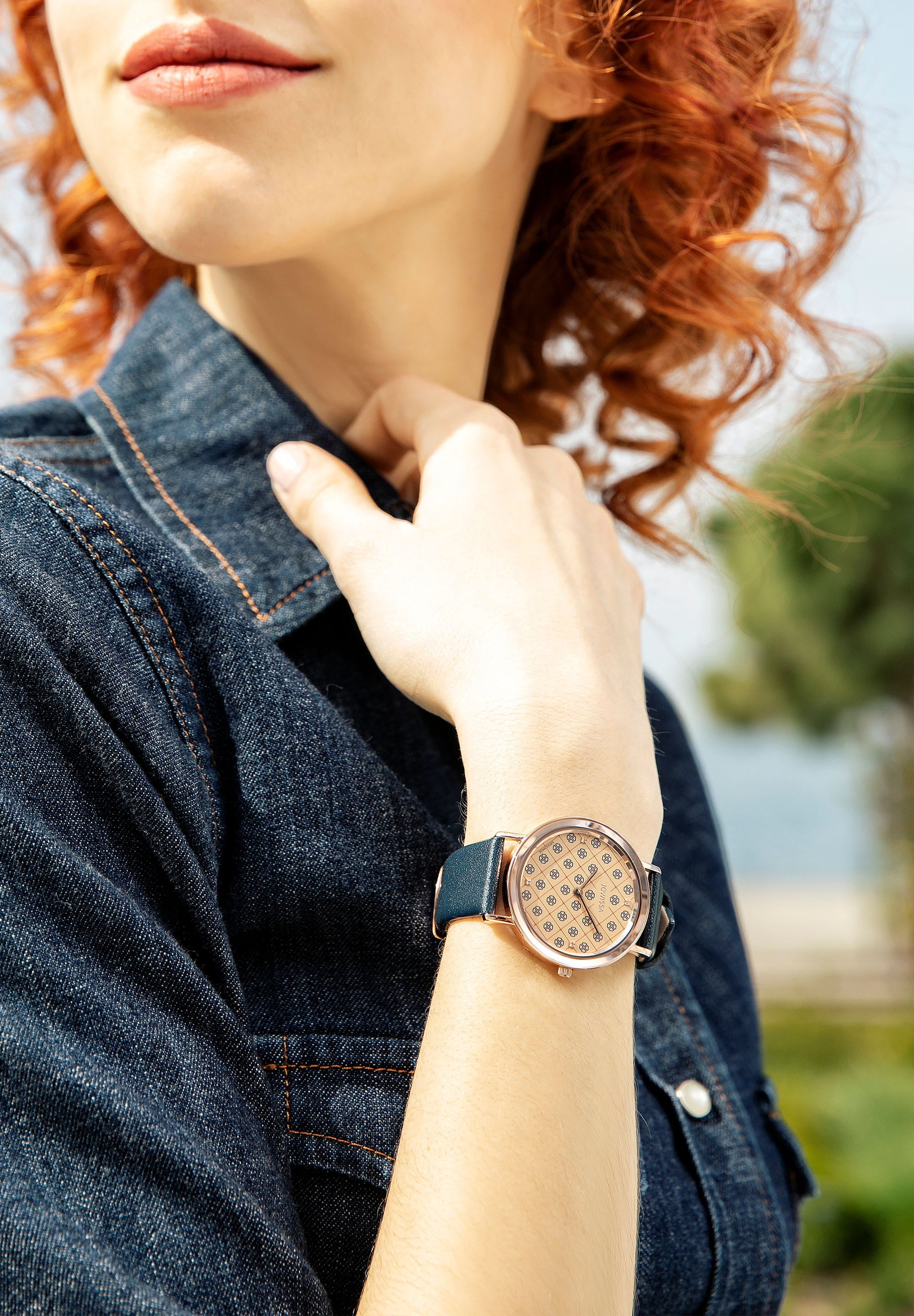 The AnWy Swiss Ladies Watch J6.223.L is a stunning timepiece that combines elegance and functionality, making it a perfect accessory for any occasion. With its 35mm stainless steel case, this watch is designed to fit comfortably on your wrist while making a bold statement. The watch features a unique gold-beige dial adorned with the brand's logo in a repeating navy blue pattern, which adds a touch of sophistication to its overall appearance.