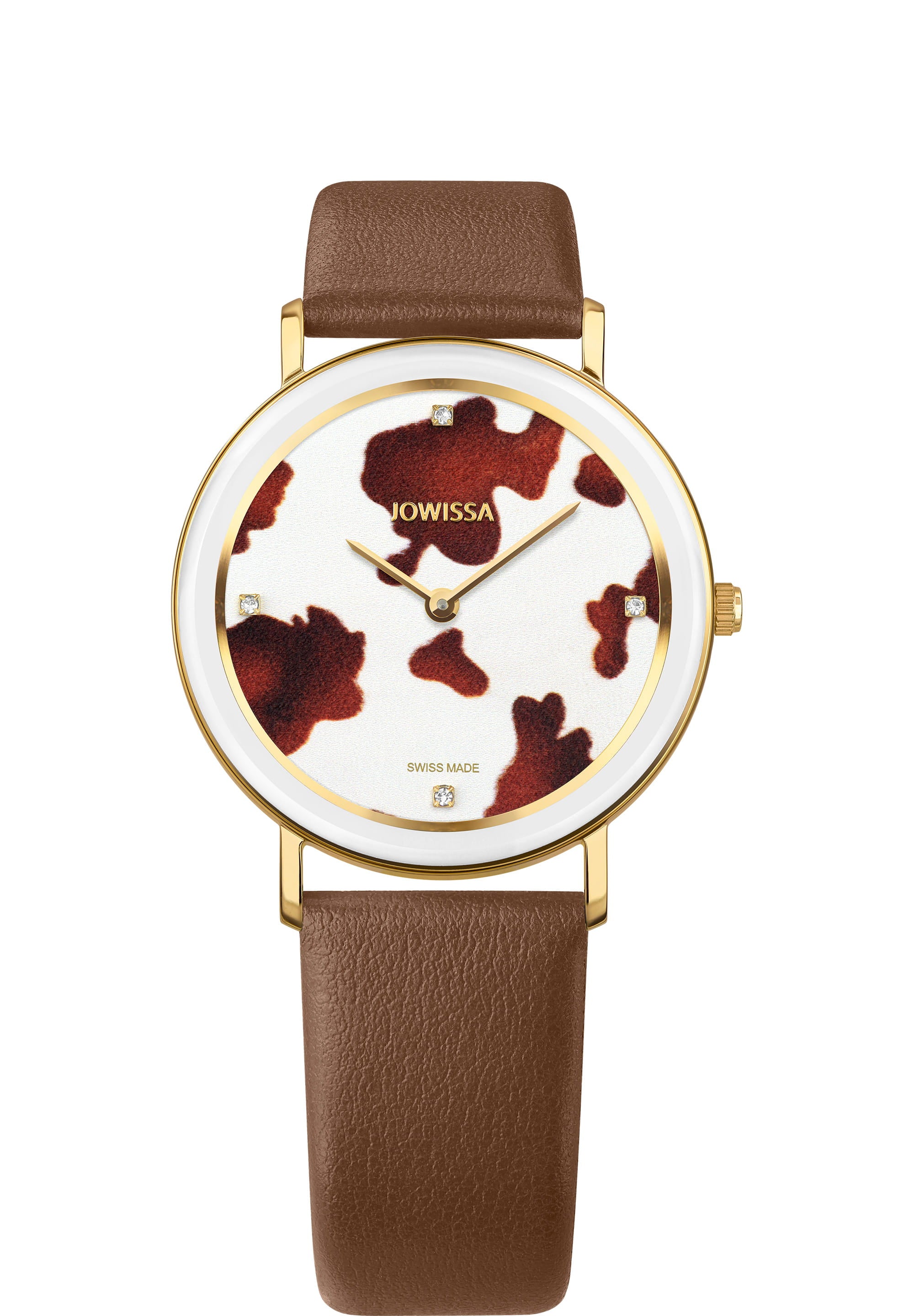 AnWy Swiss Ladies Watch J6.317.L featuring a red cow print dial, gold-tone stainless steel case, and brown leather strap.