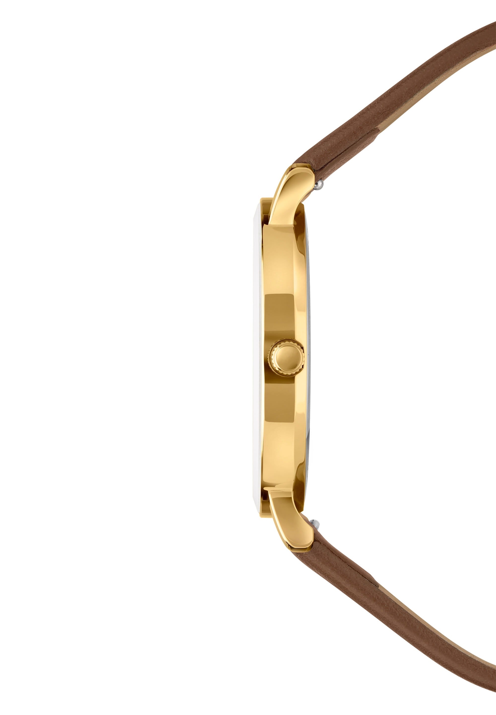 The watch case is made from high-quality stainless steel, featuring a gloss polished surface with gold plating that enhances its luxurious appearance. With a case height of just 6mm, it sits comfortably on the wrist, making it perfect for everyday wear or special occasions. The tempered mineral glass with a polished edge protects the dial from scratches, ensuring your watch remains pristine.
