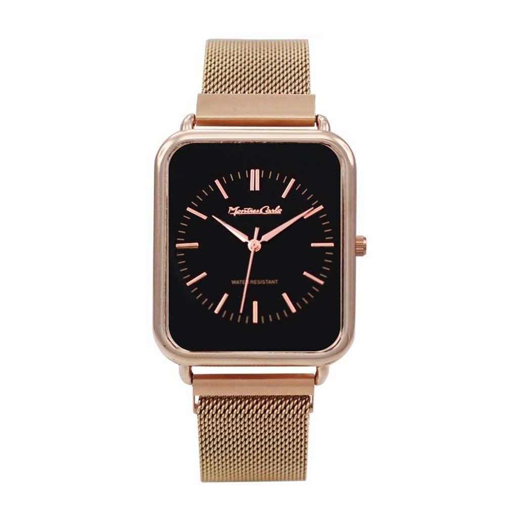 Auburn Montres Carlo Rose Gold Stainless Steel Mesh Band Watch with Magnetic Strap and Black Dial, showcasing its elegant design.