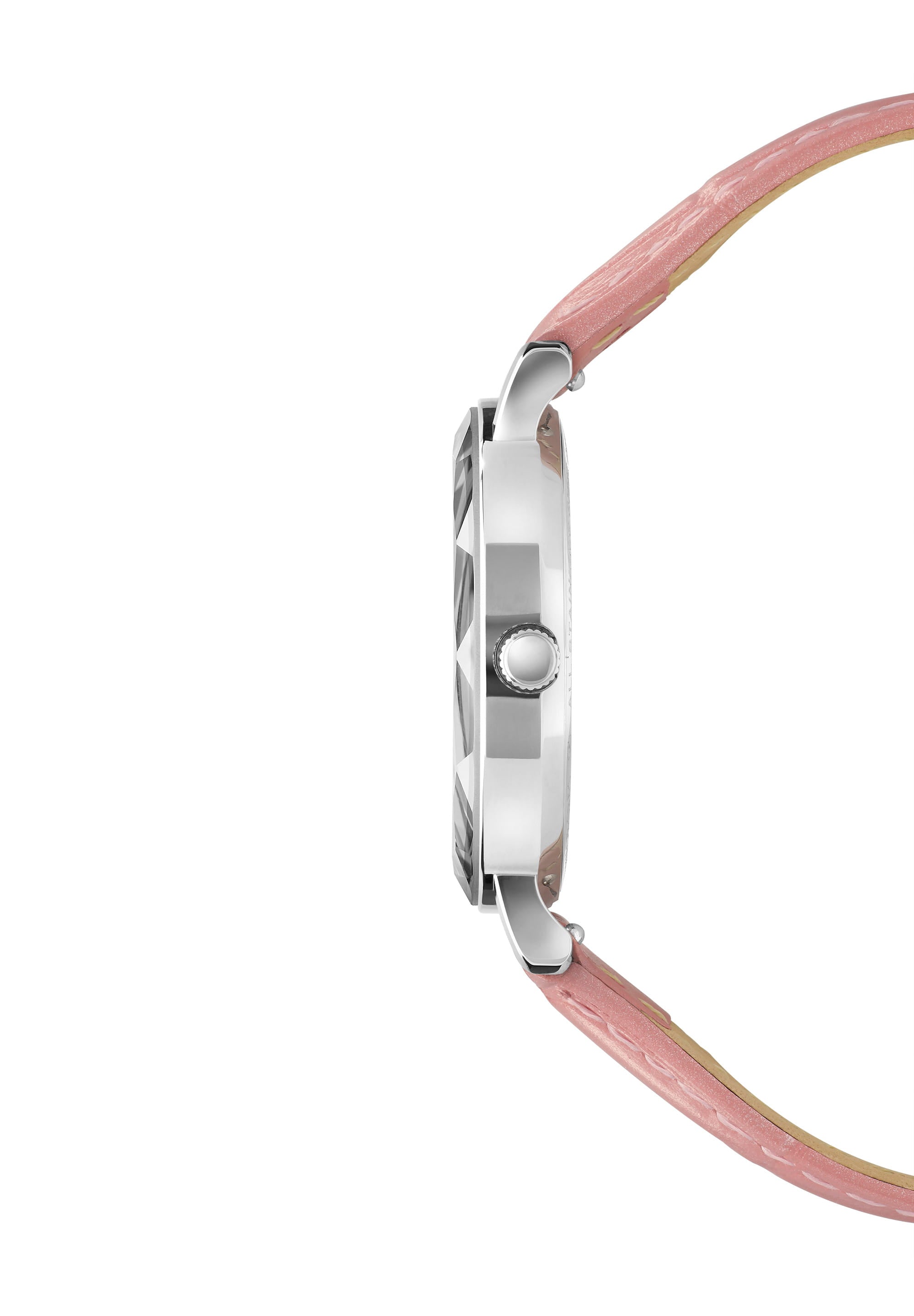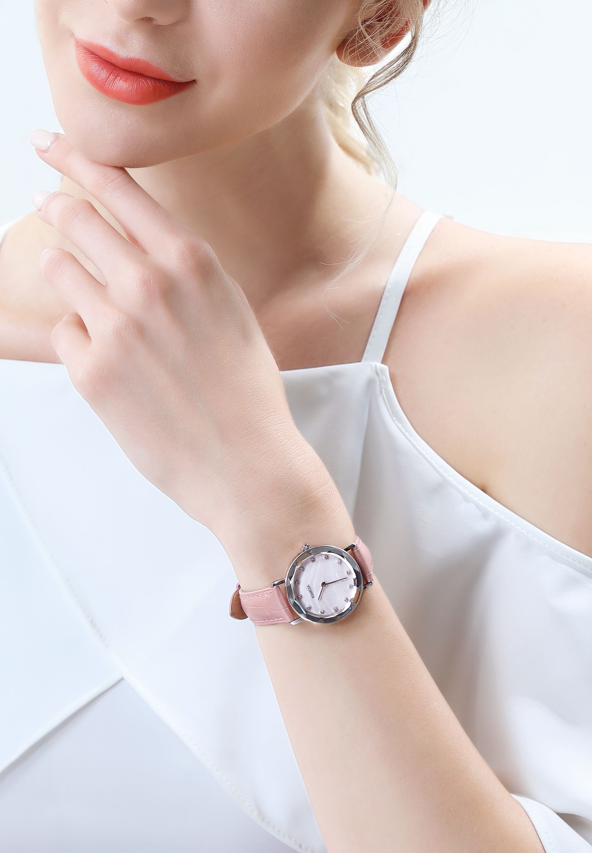 The watch features a polished silver stainless steel case with a diameter of 30.5 mm and a height of just 7 mm, making it a delicate addition to your wrist. The case is gloss polished, enhancing its luxurious appearance. The mother-of-pearl dial is adorned with 12 applied rhinestones as hour indices, adding a touch of sparkle and sophistication. The filament hands glide smoothly over the dial, ensuring you can read the time effortlessly.