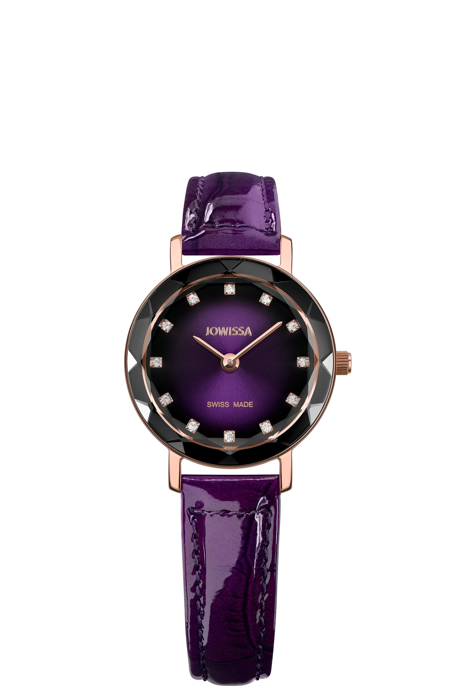 Aura Swiss Ladies Watch J5.649.S featuring a vibrant purple and black dial with gold hour hands and rhinestones, complemented by a glossy purple leather strap.