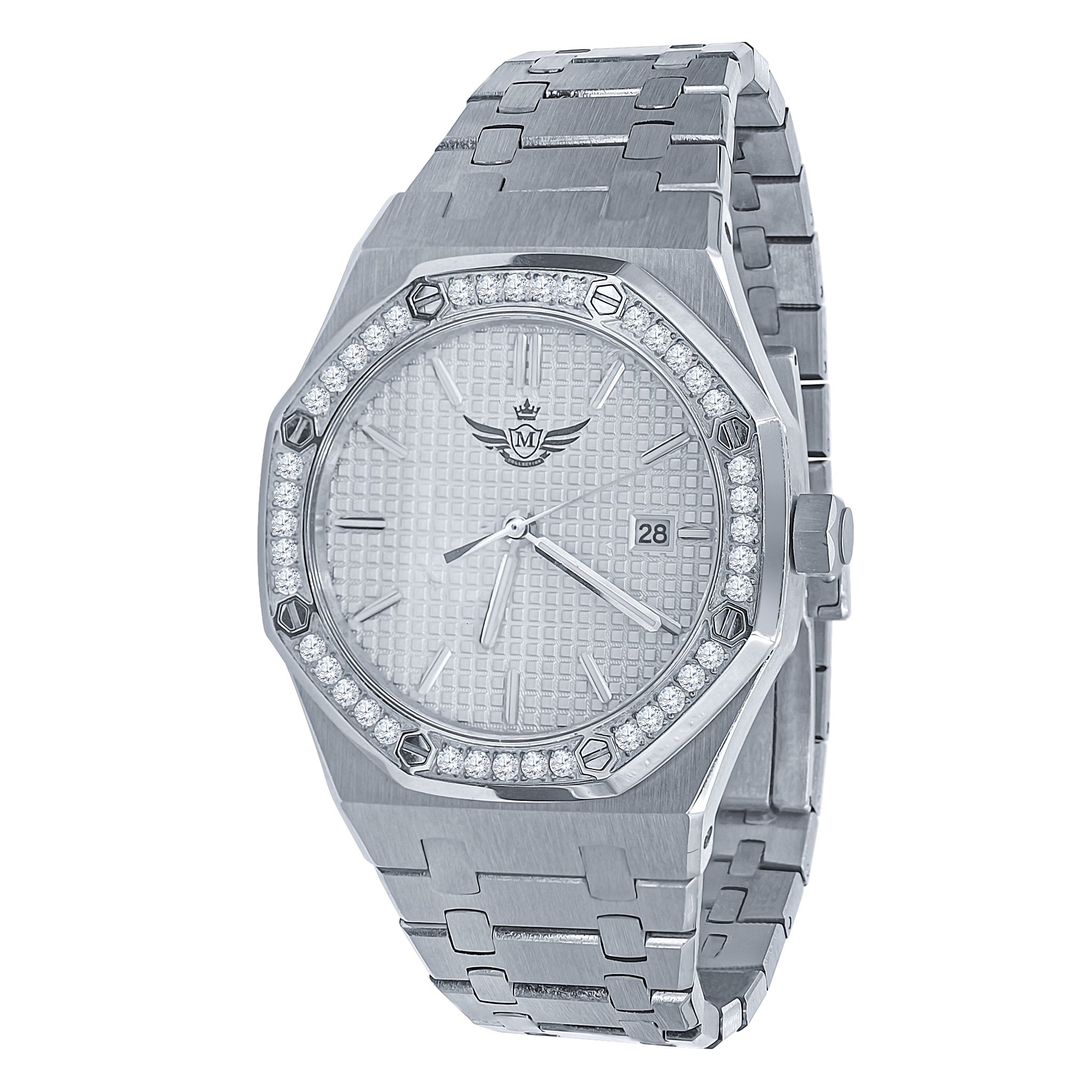 The BLUEANGEL Steel Watch is a remarkable timepiece that combines elegance and functionality. This men's chronograph watch features a striking coruscant dial that is sure to catch the eye. With its fully bling metal design, this watch is adorned with eminent CZ stones, making it a perfect accessory for both formal and casual occasions.