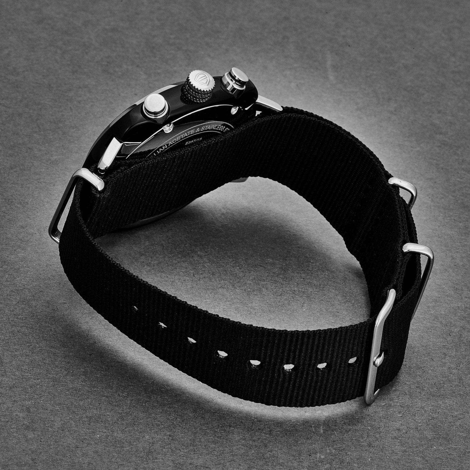 The watch is fitted with a comfortable black nylon band that measures 20mm in width and 9 inches in length. The buckle clasp ensures a secure fit, making it easy to wear throughout the day. The combination of the nylon band and the black acetate case creates a modern and sporty look that is perfect for the contemporary man.