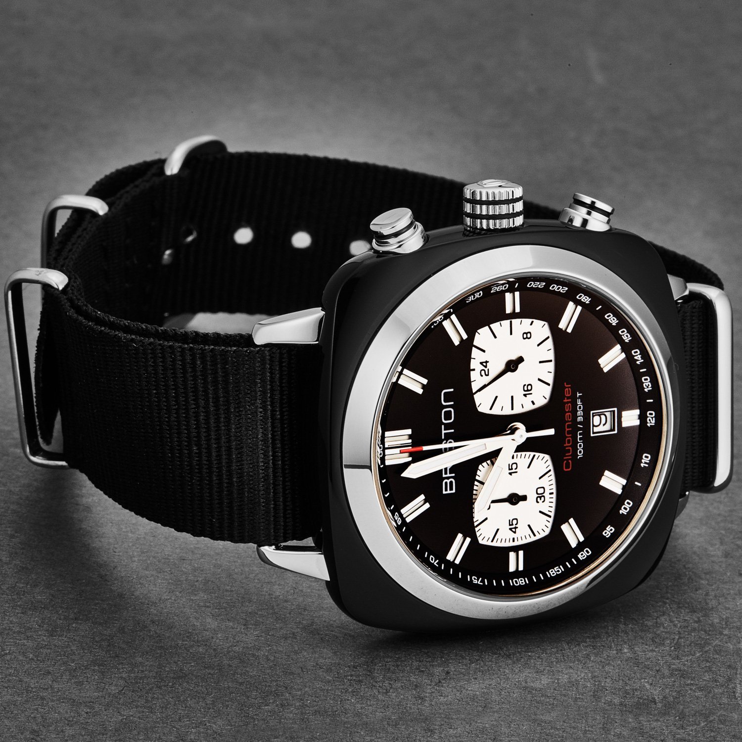 Briston Men's 17142.SA.BS.1.NB 'Clubmaster Sport' watch featuring a black dial, black acetate case, and nylon band.