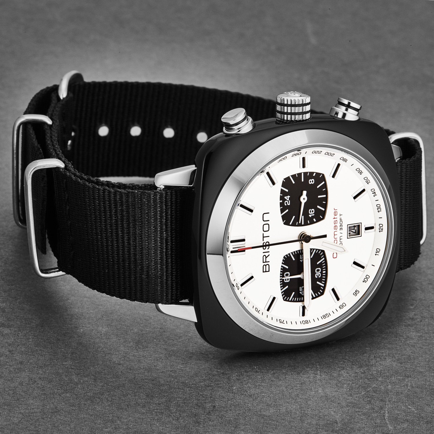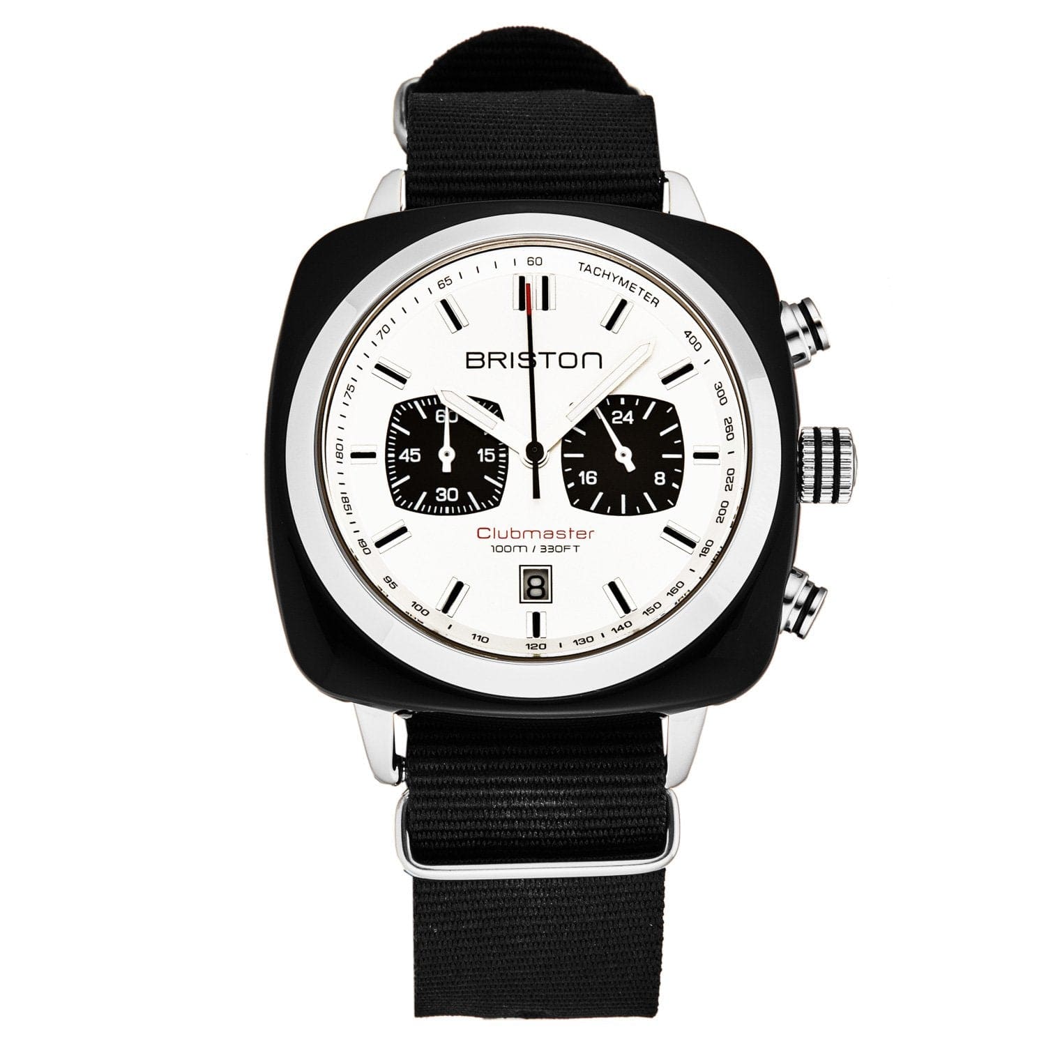 Briston Men's 17142.SA.BS.2.NB 'Clubmaster Sport' watch featuring a white dial, black acetate case, and nylon band.