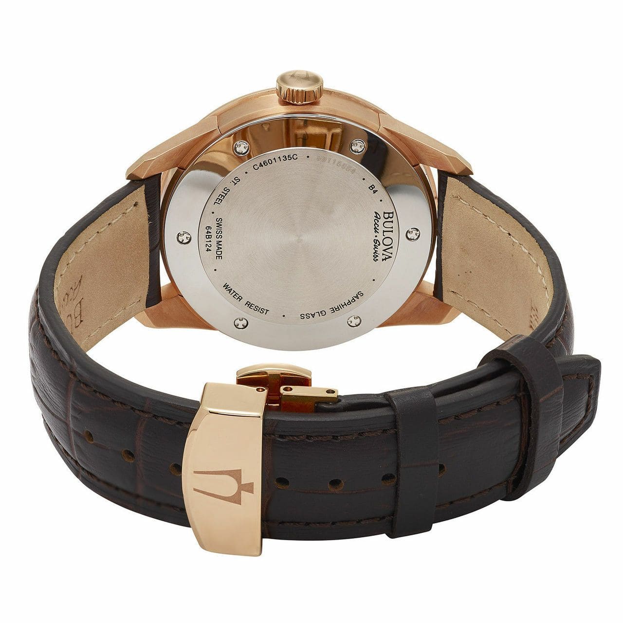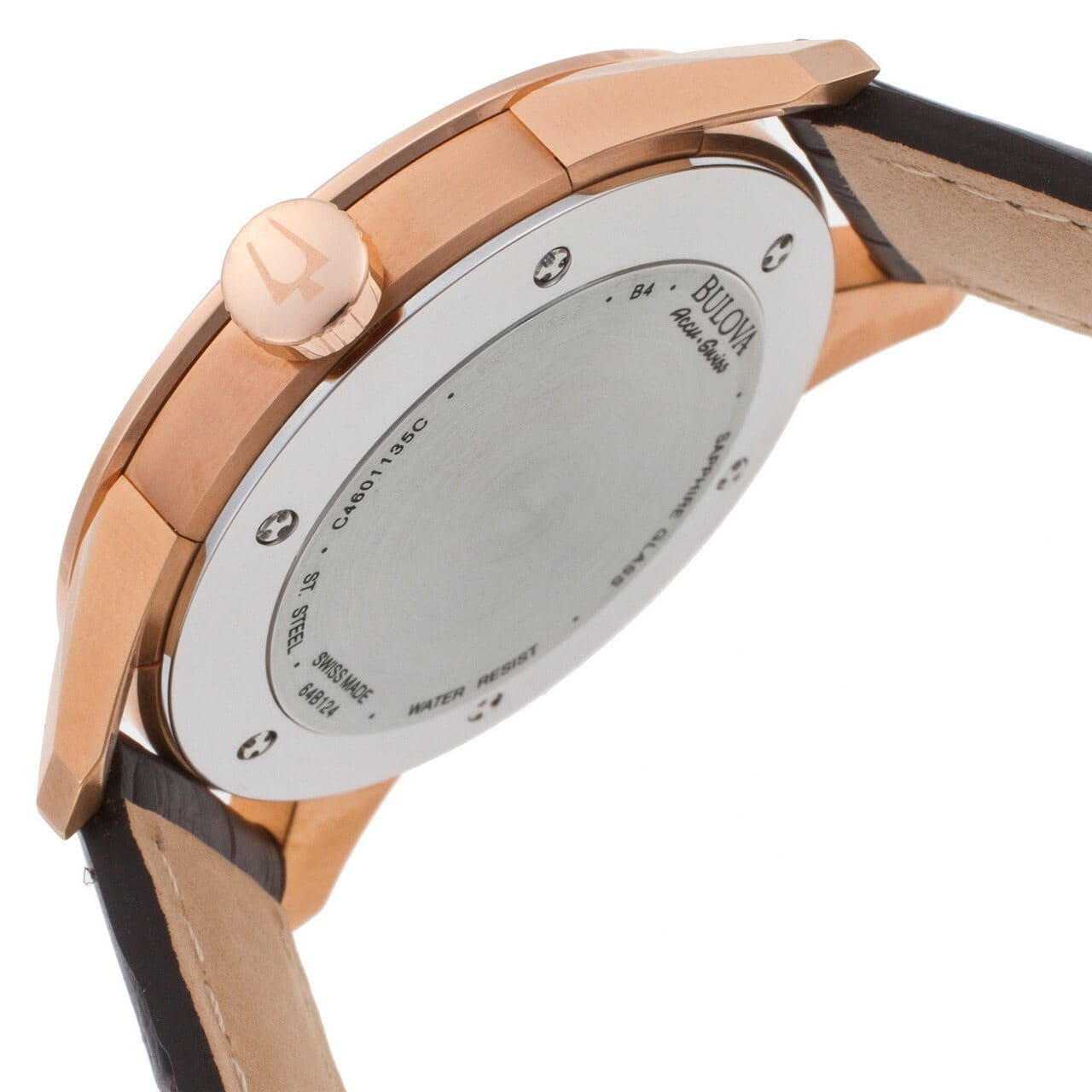 Bulova 64B124 Accu Swiss Murren watch featuring rose gold tone case, brown dial, and genuine leather strap.